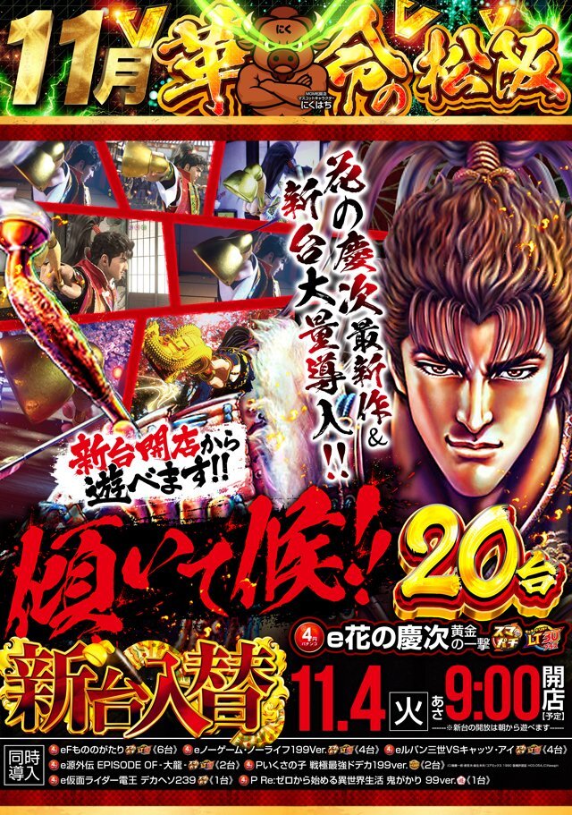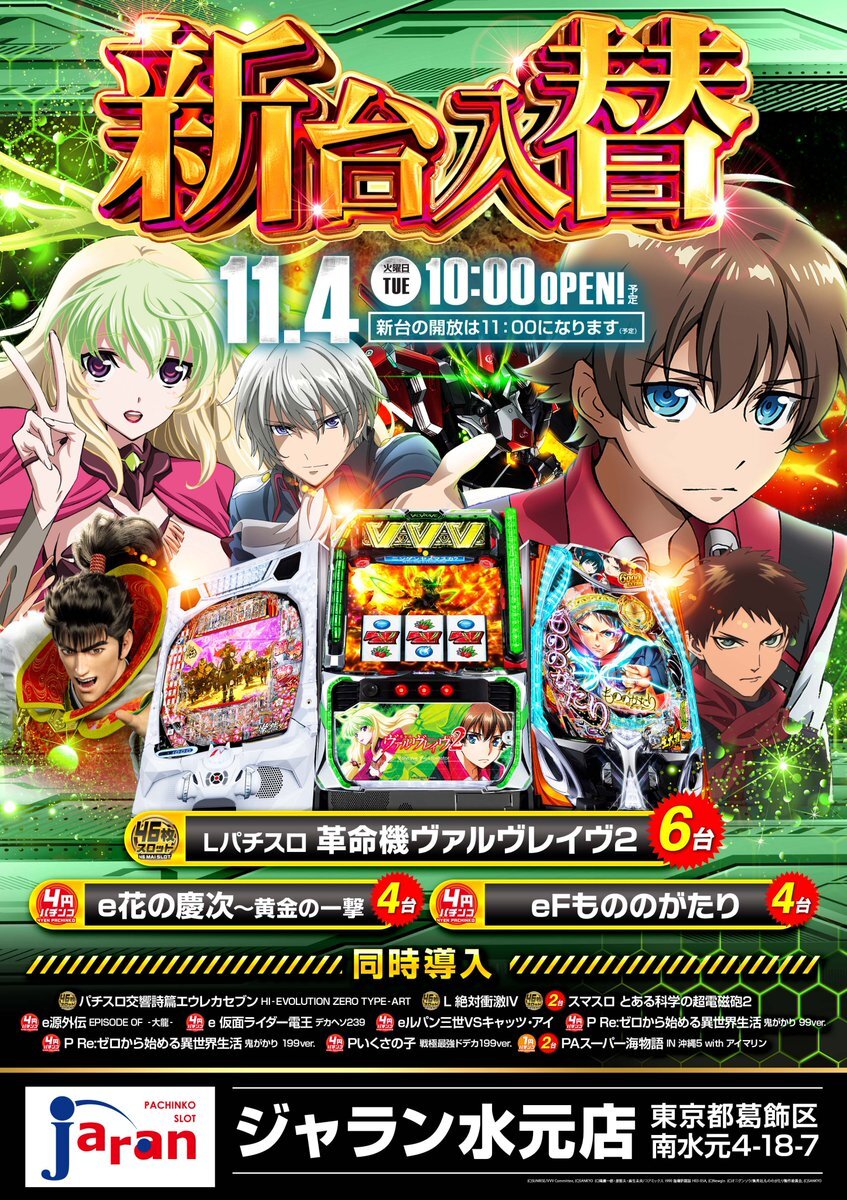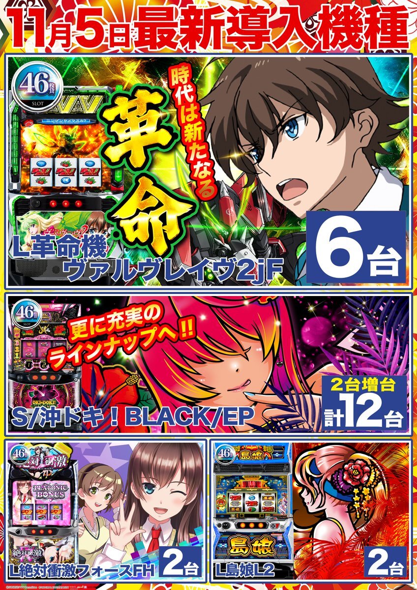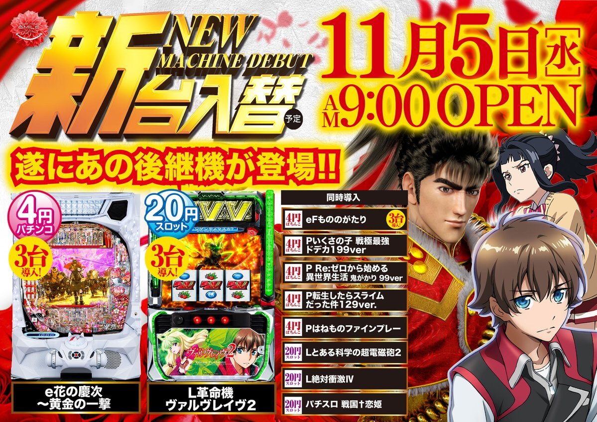 #ダイナム #新台入替 🌟🌟新台入替🌟🌟 11月6日(木)開催! 1パチンコ #Reゼロ鬼がかり99ver なんと4台! 他1機種 2パチンコ #花の慶次~黄金の一撃 他3機種 10スロット #ヴァルヴレイヴ2 10スロで打てる! 他1機種 全8機種計14台‼️ お待ち致しております pic.x.com/IPYN8SrGbG