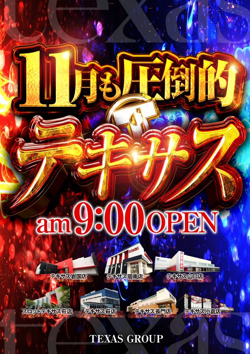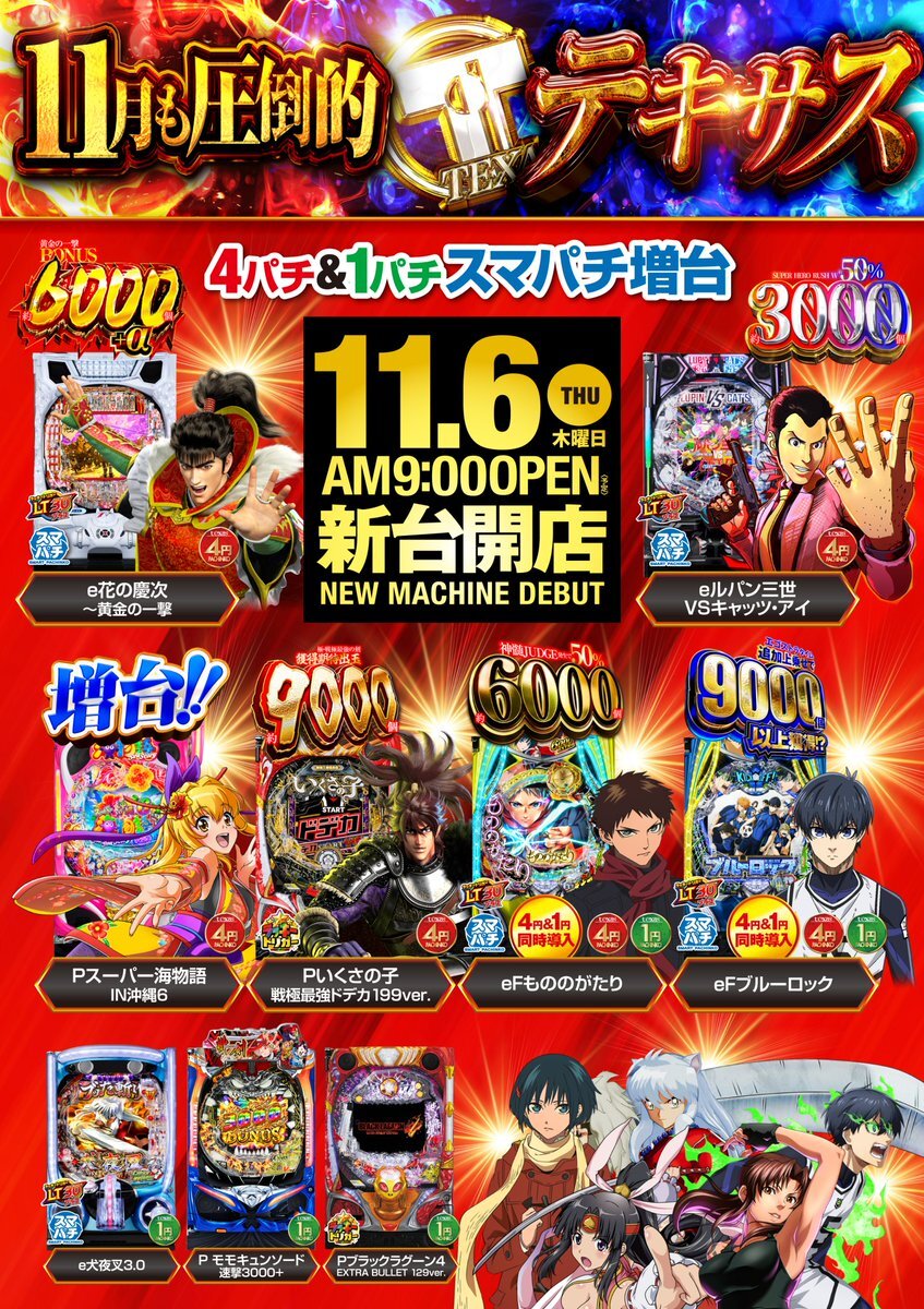おはようございます☀️ #テキサス萩店 です😁 1⃣1⃣月6⃣日(木) 🎉#新台開店🎉 🆕スマパチ最新機種🆕 #花の慶次~黄金の一撃 #もののがたり 🔸増台🔸 #海物語IN沖縄6 #ブルーロック 他にもバラエティコーナーや 1円パチンコにも‼️ 最新台導入☺️ 新台打つなら 当店でお楽しみください🥰 pic.x.com/UHjhl0RAq8
