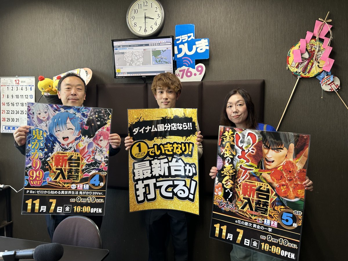 📻ラジオDJ🎙️小林&白石です 今回は #11月7日(金)📢新台入替情報をお伝えします。新台は9機種19台導入致します! パチンコ #Reゼロ鬼がかり、#花の慶次~黄金の一撃 は✨1パチでいきなり打てる!✨ さあ抽選は⏰9時40分からスタート! #ダイナム #国分店 pic.x.com/8P3oBqpsNW