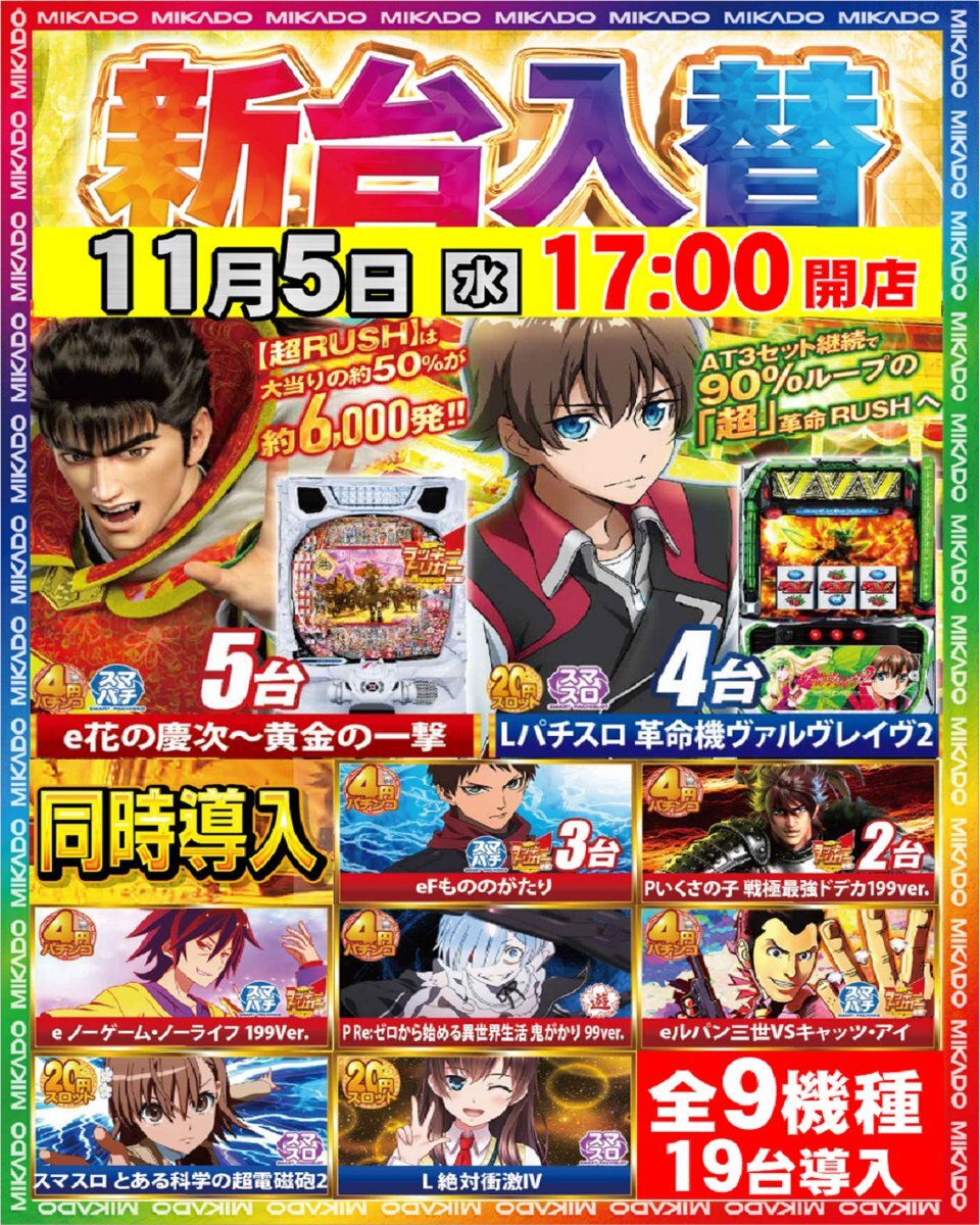 こんにちは 本日この後1⃣7⃣時開店‼️ ✨新 台 入 替✨ ⏬導入ラインナップ⏬ L #ヴヴヴ2 L #レールガン2 L #絶対衝撃4 e #花の慶次~黄金の一撃 e #もののがたり などなど 計9機種19台導入✨ 夕方からは #ミカド へGO! pic.x.com/IEvFqYnW1i
