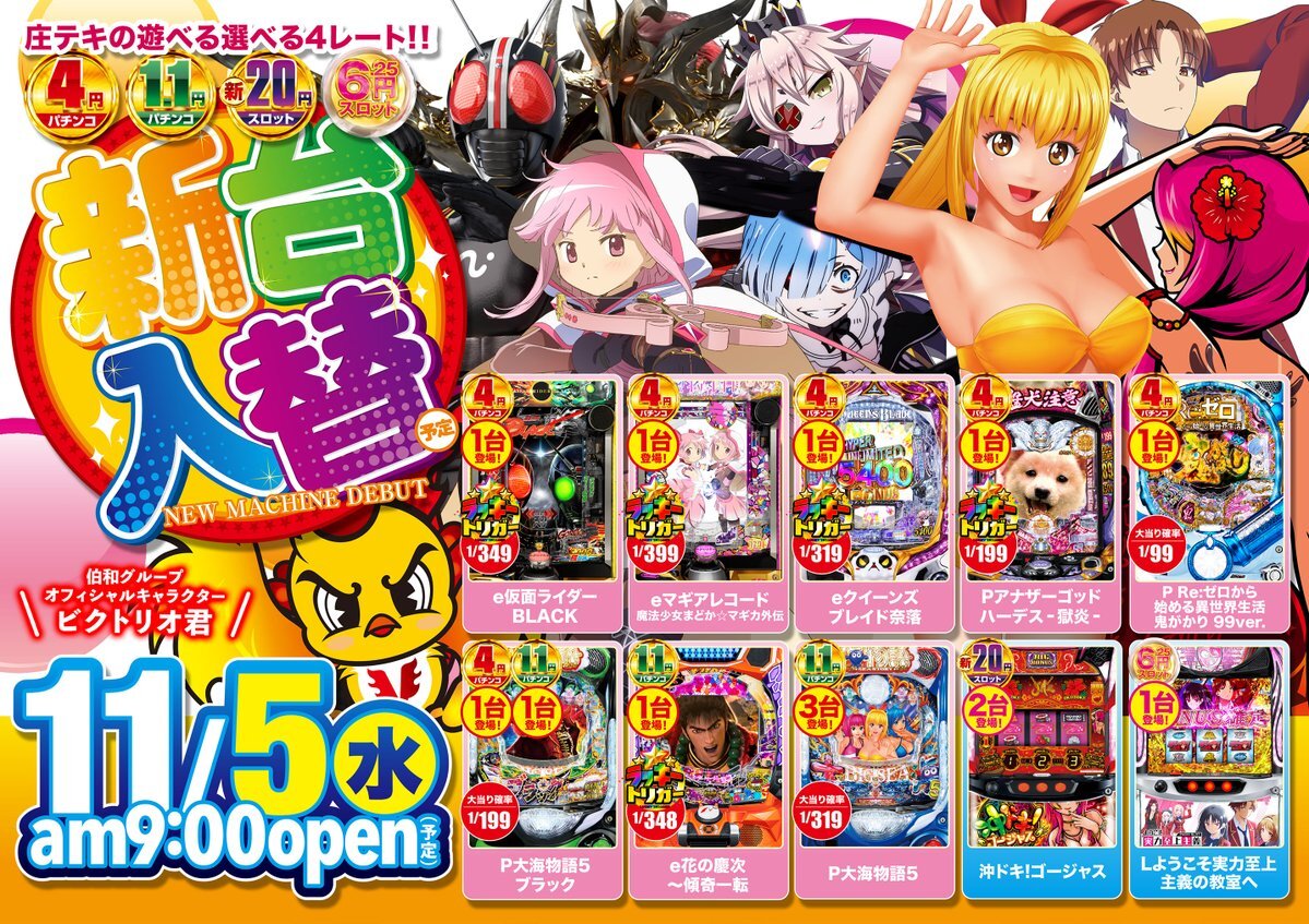 おはようございます☀️ 庄ビクのしらPです😎 ✨✨1⃣1⃣月5⃣日(水)✨✨ 🌈🌈#新装開店予定🌈🌈 🚨名機の後継機が登場🚨 ▶️シリーズ屈指の新たなヒリツキ! #花の慶次~黄金の一撃🐯 ▶️前作を超える爽快感! #革命機ヴァルヴレイヴ2🤖 本日も9⃣時開店! ご来店お待ちしております🫡 pic.x.com/2S1PeDiwHO
