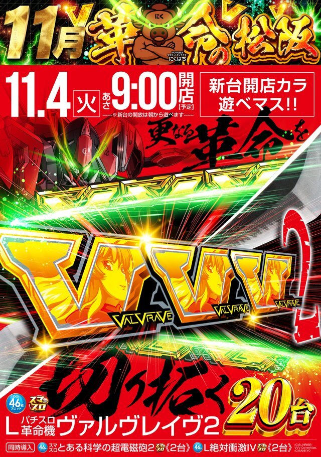 こんばんは🌜 最新台も導入済み✨ 明日 11月6日(木) 10時オープン🤩 9時40分 入場抽選スタート‼️ 皆様のご来店 お待ちしております📢 #ヴァルヴレイヴ2 #花の慶次~黄金の一撃 pic.x.com/tomltX3tD7