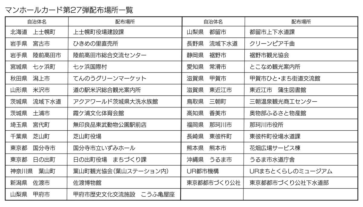 マンホールカード第27弾のお知らせ✨ 皆さま、お待たせしました❗️ 第27弾のマンホールカードを発行する自治体等と配布場所が決まりましたのでお知らせします✨ 今回も新しく参加された団体をはじめ、沢山の素敵なデザインのカードが発行されます✨ 配布まで、もうしばらく楽しみにお待ちください❗️