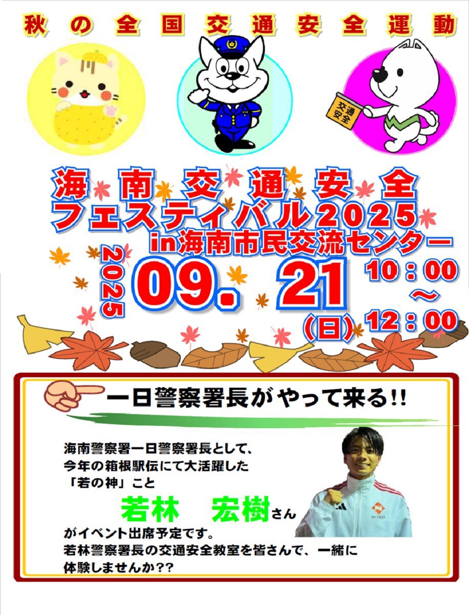 【海南警察署】 秋の全国交通安全運動初日の9月21日(日)、今年の箱根駅伝で大活躍をみせた元青山学院大学陸上競技部出身の若林宏樹氏を一日警察署長に委嘱し、海南交通安全フェスティバル2025を実施しました。 #和歌山県警 #若林宏樹 pic.x.com/hD4b1AOaQJ