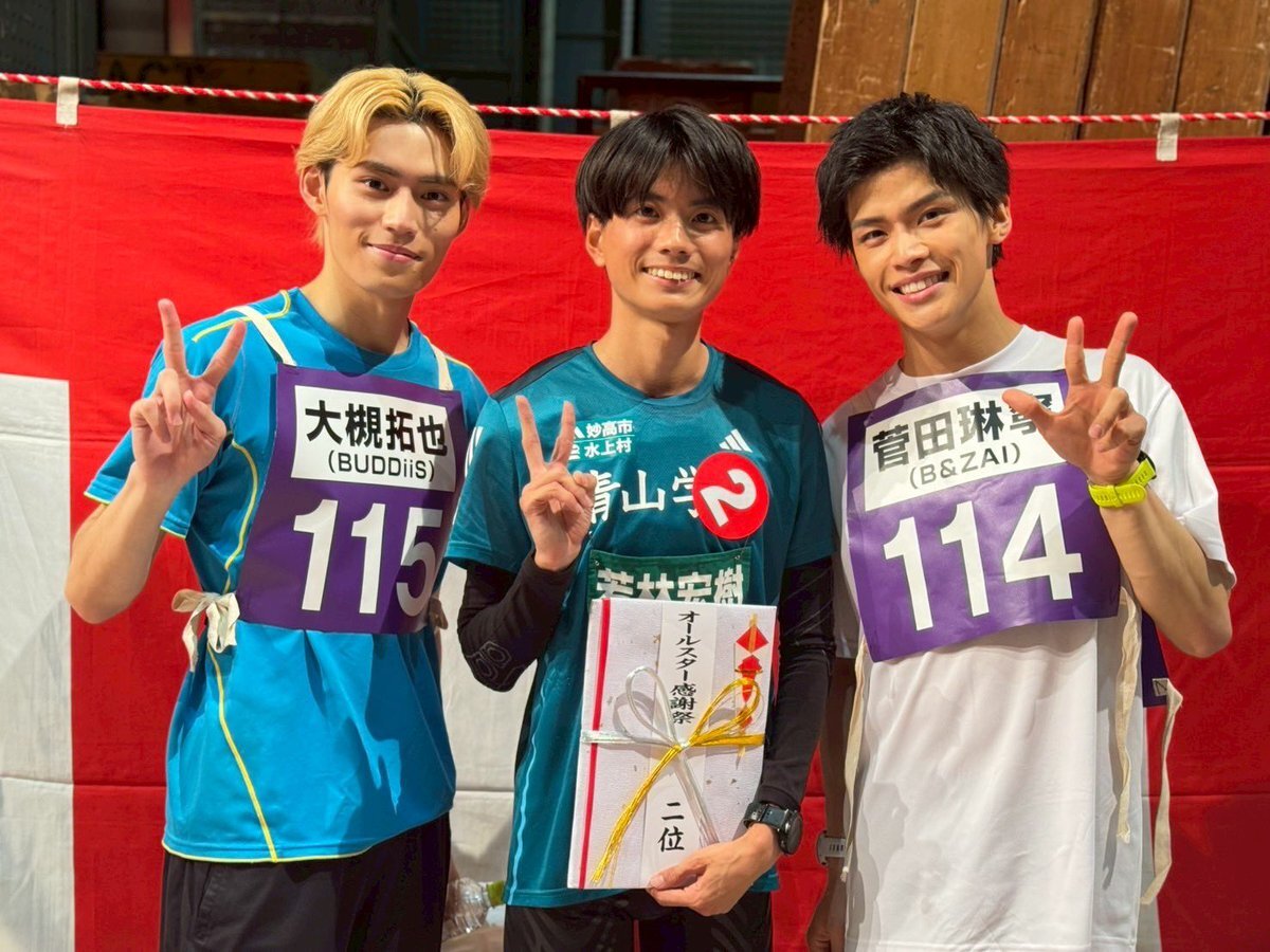 #赤坂5丁目ミニマラソン🏃‍♀️🏃‍♂️ お疲れ様でした🔥 #大槻拓也 さん(#BUDDiiS#若林宏樹 さん(#青山学院大学#菅田琳寧 さん(#BandZAI ) 走り終わって健闘を称え合う3人‼️ #菅田琳寧 さんは この後のクイズも頑張ってください💪 #オールスター感謝祭25春 @allstar_tbs pic.x.com/Azs6lLoEtH