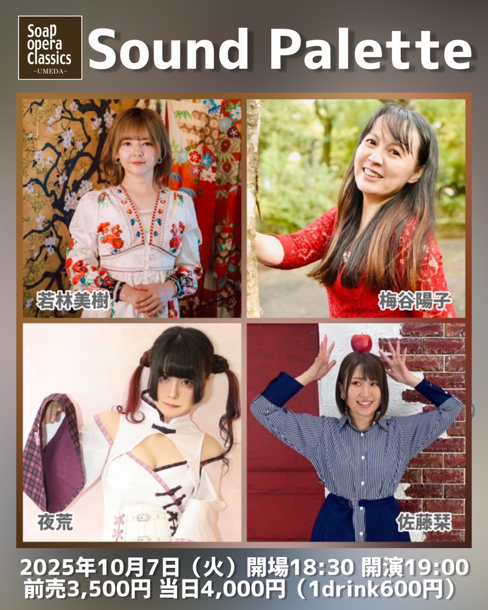 10月7日(火) 「Sound Palette」 開場18:30/開演19:00 前売3,500円/当日4,000円[1drink別600] 出演:#若林美樹 #佐藤栞 #夜荒 #梅谷陽子 pic.x.com/7lluIqC0xE