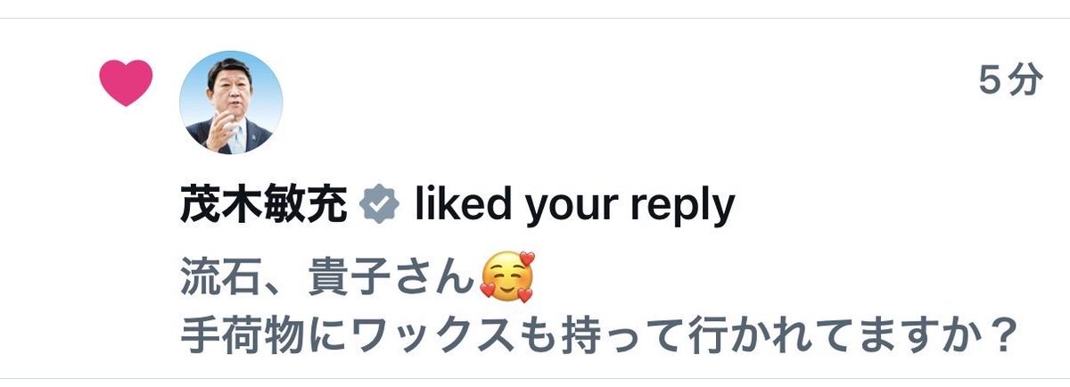 え〜😍 茂木外務大臣にいいねされてる🥰 #茂木敏充 #茂木敏充外務大臣 pic.x.com/gYOuoYGi7S x.com/hxzrpa0dtmvy60…