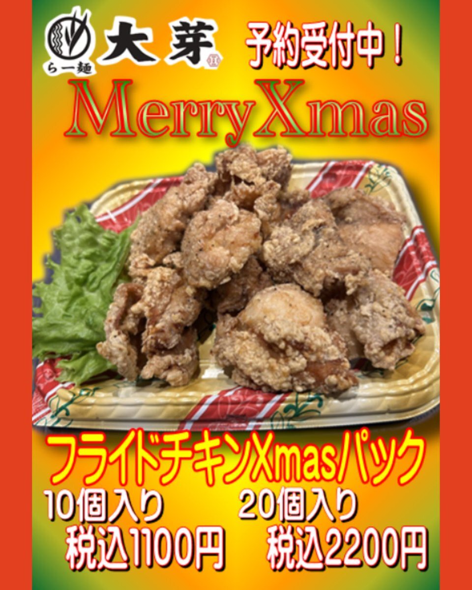 日頃より ご来店ありがとうございます🍜 Xmas限定🤶🎄 自家製フライドチキン🍗 予約受付スタートします‼️ XmasPartyを彩る料理のひとつに ぜひよろしくお願いします🙇 ※セット数限定となります‼️ #茨城県下妻市 #拡散希望 #中華そば #自家製フライドチキン #クリスマス #らー麺大芽 pic.x.com/7k9HnEOxLn