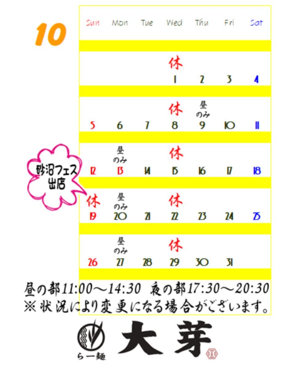 日頃より ご来店ありがとうございます😊 10月の営業予定となります🍜 ※19日は砂沼フレンドリーフェスティバル 出店の為店舗はお休みとなります🙇 ご来店心よりお待ちしております😊 #茨城県下妻市 #中華そば #らー麺大芽 pic.x.com/79VyGADpFP