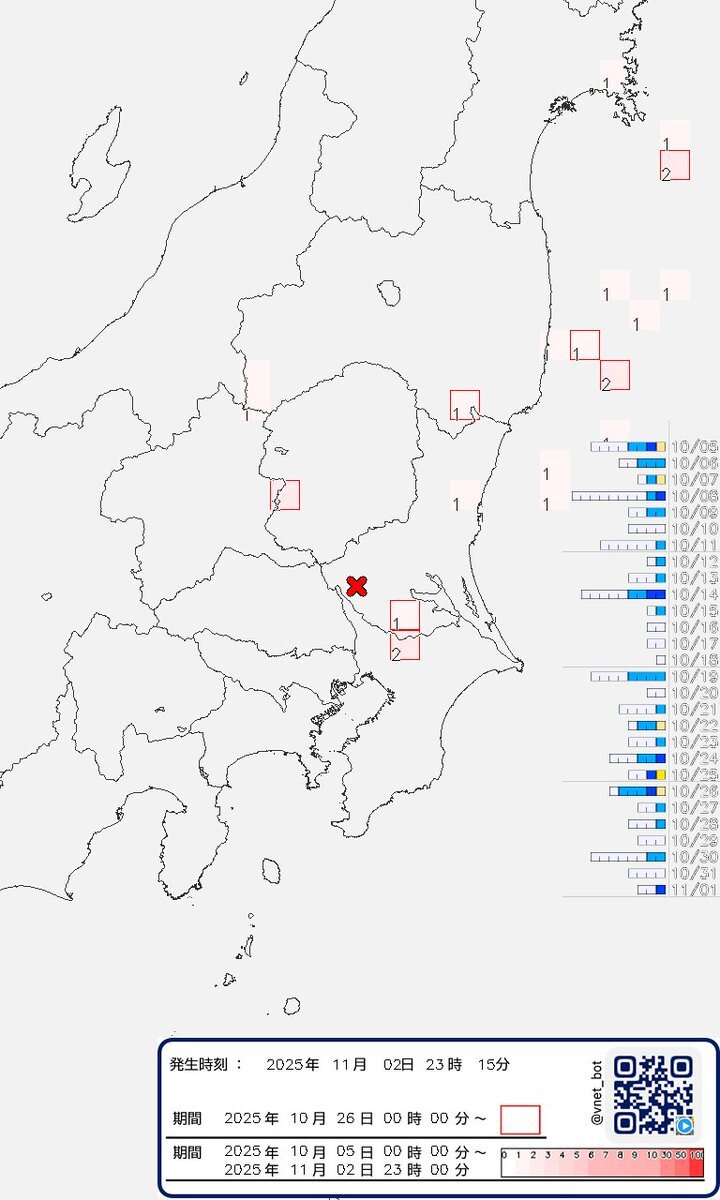 2025年11月02日 23時15分頃 の地震 茨城県南部 最大震度:2 マグニチュード:3.5 深さ:40km 震度0以上に変化した箇所のみ表示しています。 🔗 jma.go.jp/bosai/map.html… 🔗 data.jma.go.jp/multi/quake/qu… #地震 #茨城県南部 pic.x.com/XL08heJvUT