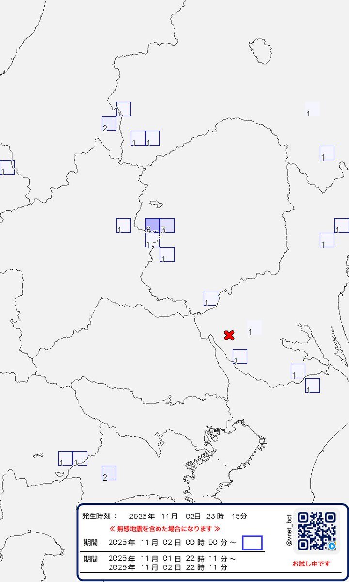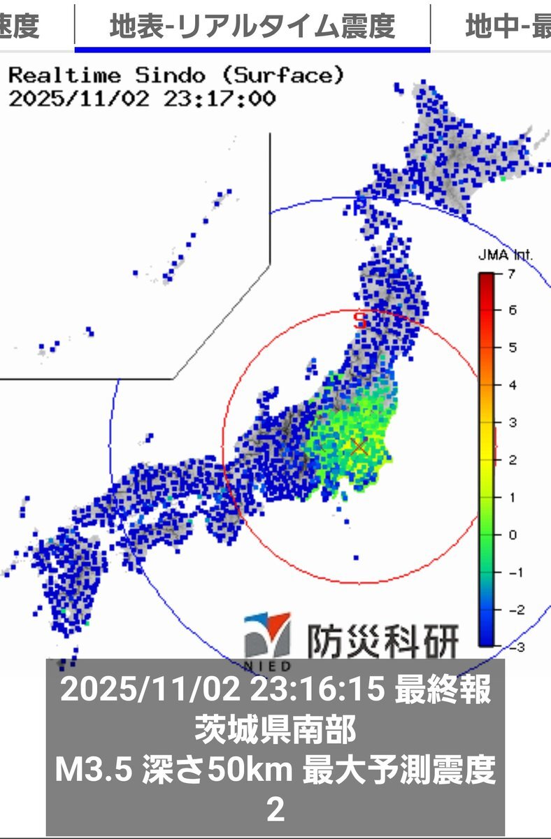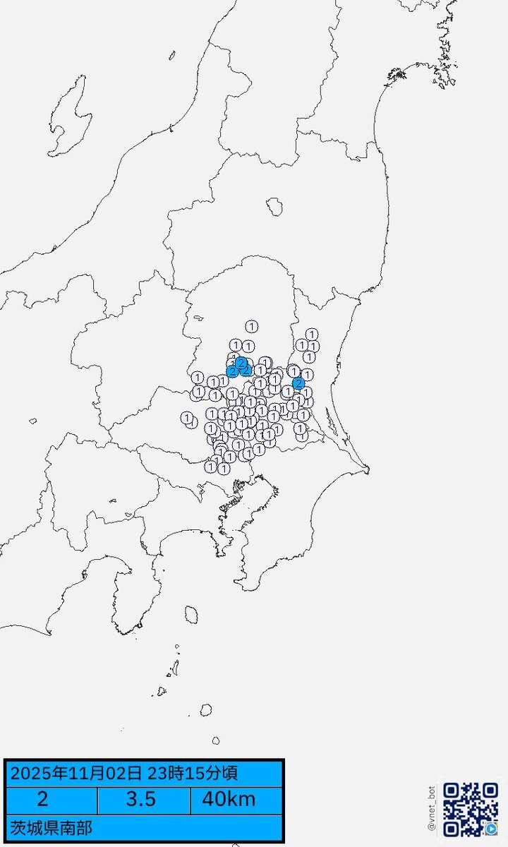 2025年11月02日 23時15分頃 茨城県南部 最大震度:2 マグニチュード:3.5 深さ:40km 🔗 jma.go.jp/bosai/map.html… 🔗 data.jma.go.jp/multi/quake/qu… 停①) #地震情報 #地震 #茨城県南部