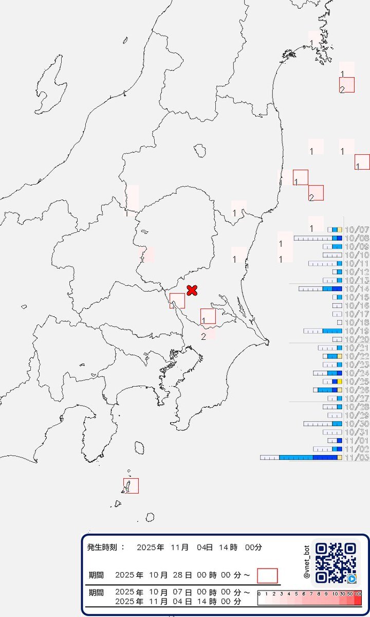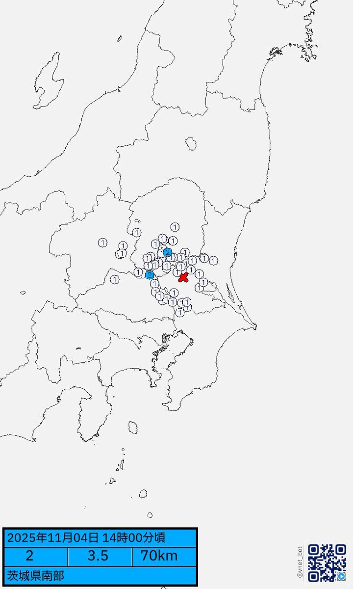2025年11月04日 14時00分頃 茨城県南部 最大震度:2 マグニチュード:3.5 深さ:70km 🔗 jma.go.jp/bosai/map.html… 🔗 data.jma.go.jp/multi/quake/qu… 停①) #地震情報 #地震 #茨城県南部