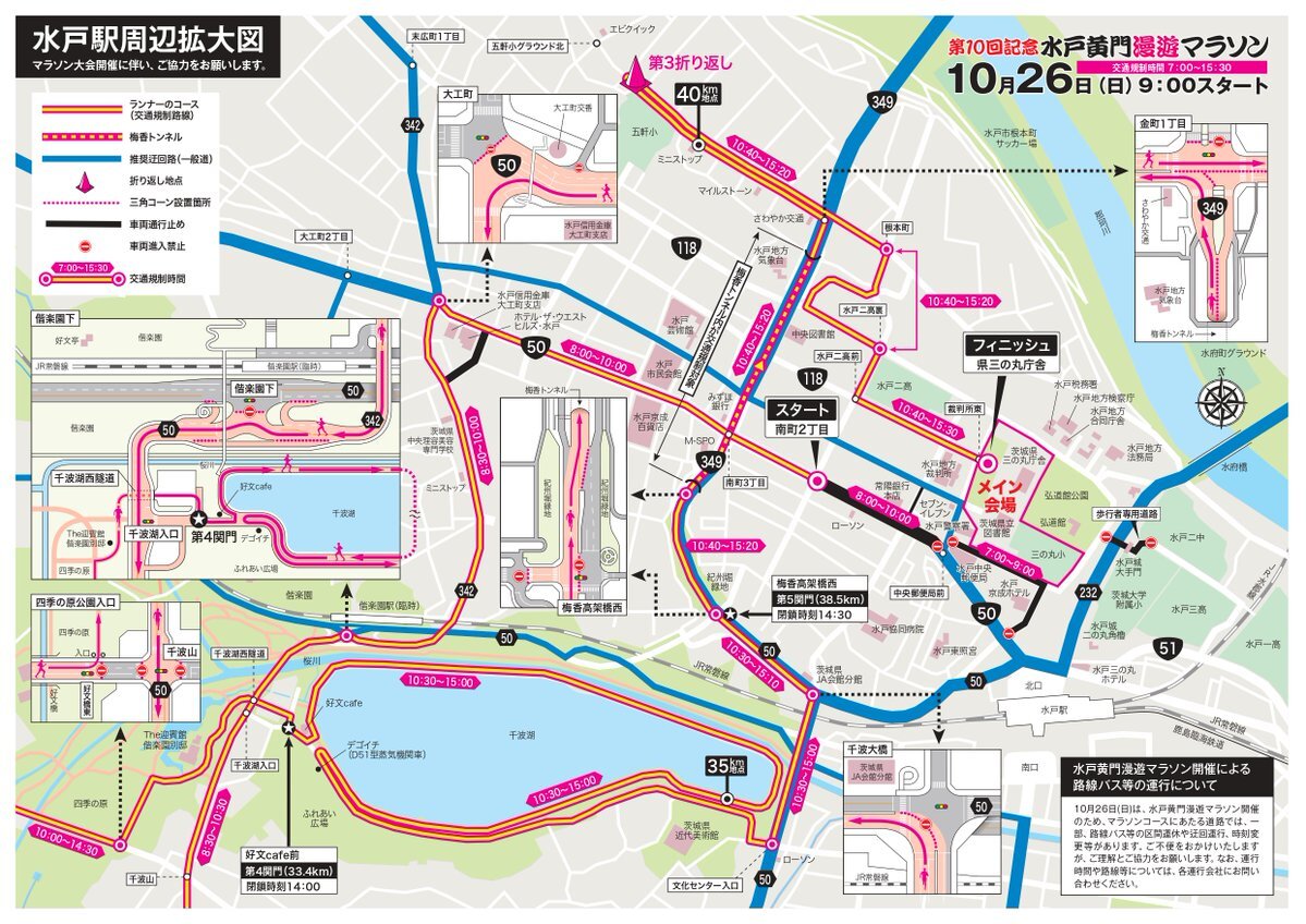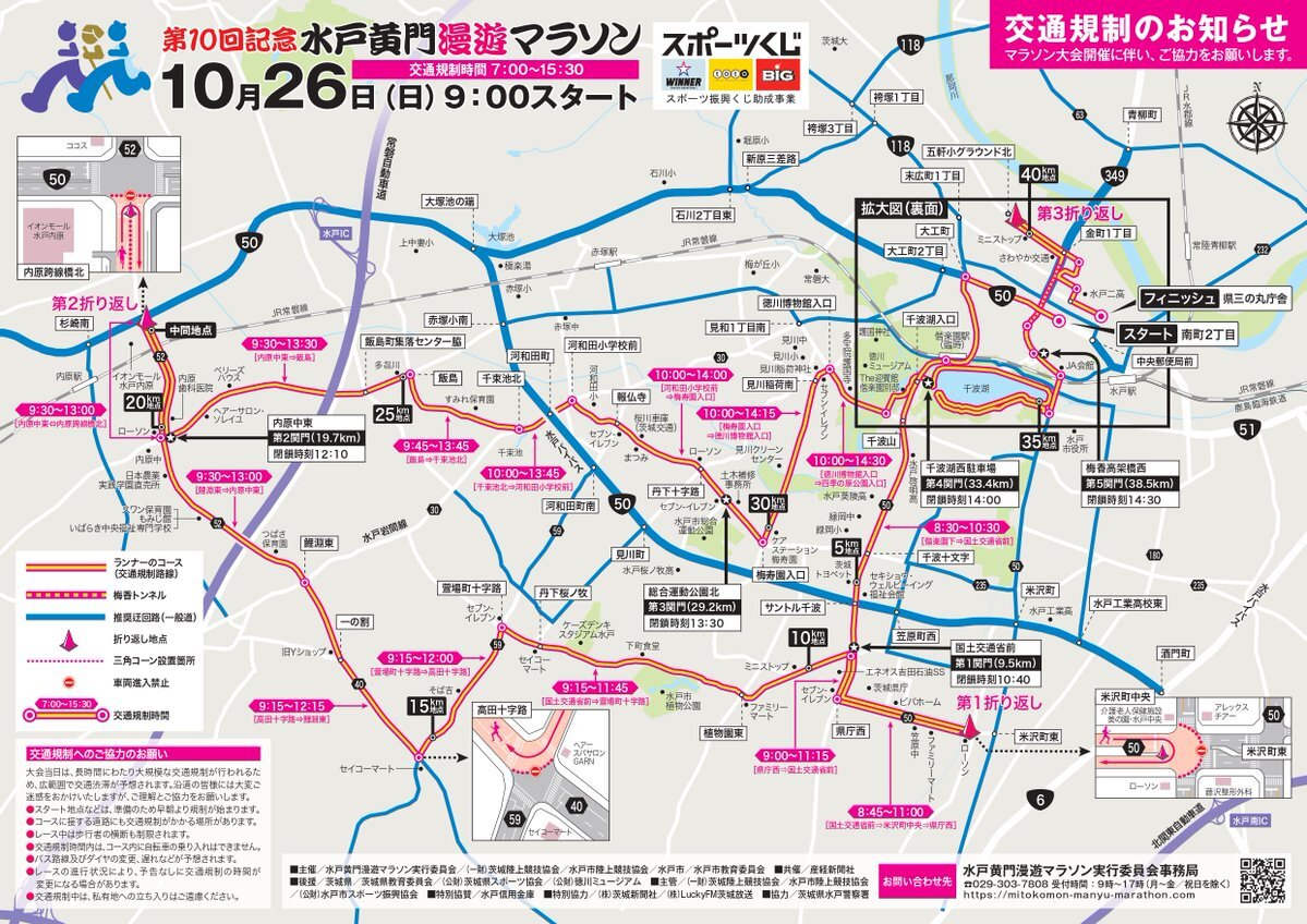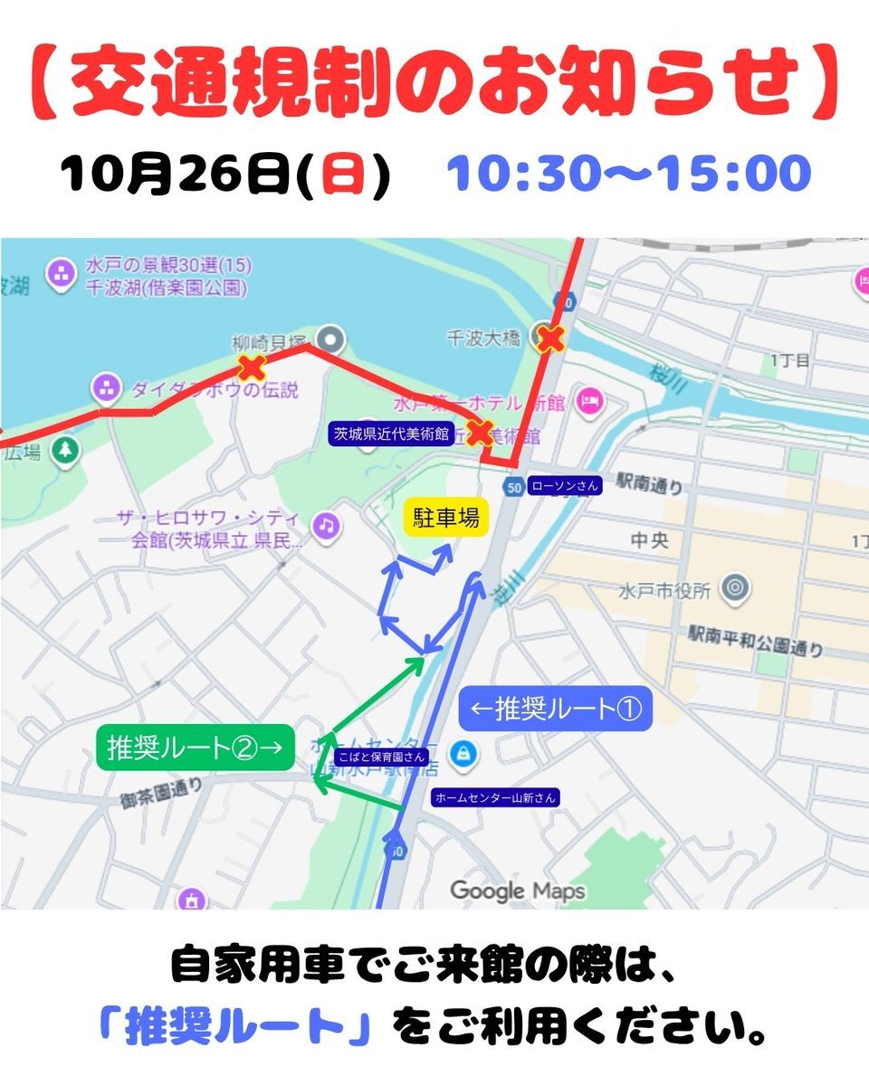 10/26(日)は #水戸黄門漫遊マラソン 開催のため #茨城県近代美術館 周辺道路で一部交通規制があります。文化センター入口交差点~千波湖周辺道路は10:30~15:00まで車両通行不可です。美術館にお越しの際は、係員の誘導に従ってください。mitokomon-manyu-marathon.com pic.x.com/BOZ2xcc0Qx