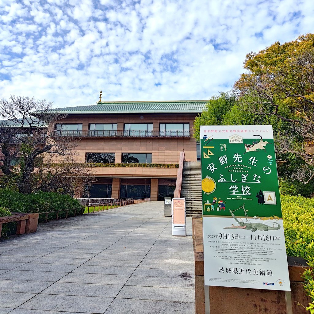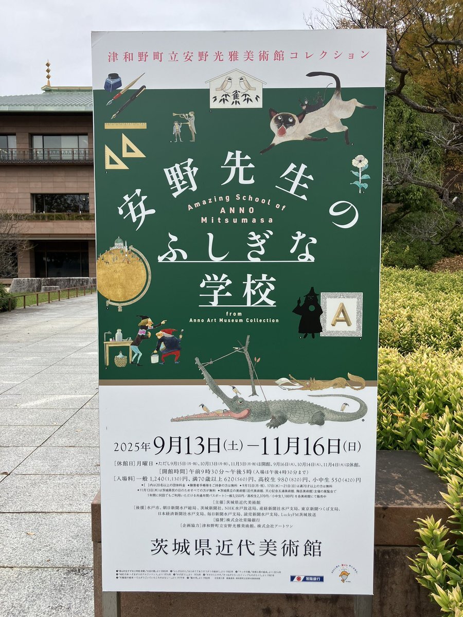 #茨城県近代美術館 #水戸市 【2025年10月26日】 「安野先生のふしぎな学校」を開催中(〜11/16) 絵本作家:安野光雅さんの企画展です。一部を除き撮影不可。 ・美術館外観 ・展示室入口 図録から ・「かげぼうし」 ・「おおきな ものの すきな おうさま」 「おおきな⋯」は単純に絵が楽しい。 pic.x.com/g27Gs8KaQ7