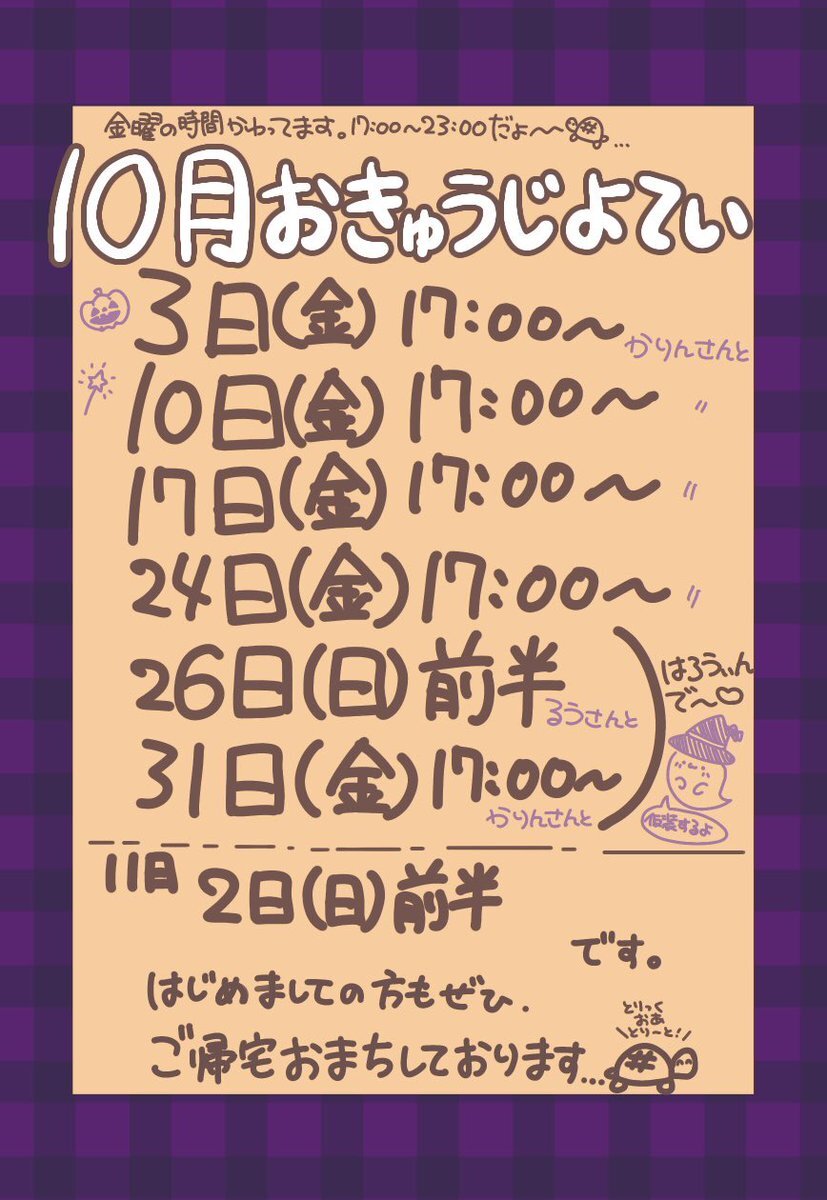 かめあきです。🐢 10月のお給仕予定です。👻 金曜後半かめあき17:00~になりました 25~31日ははろうぃんで~ですよ🎃26日はるうさんとコンセプト合わせます🙄かめあきは期間中2回お給仕の予定です。さてどんなメイドさんたちが見られるでしょうか。。。お楽しみに🫶 よろしくお願いします😌 #茶々娘 pic.x.com/qFtUszn1Hl