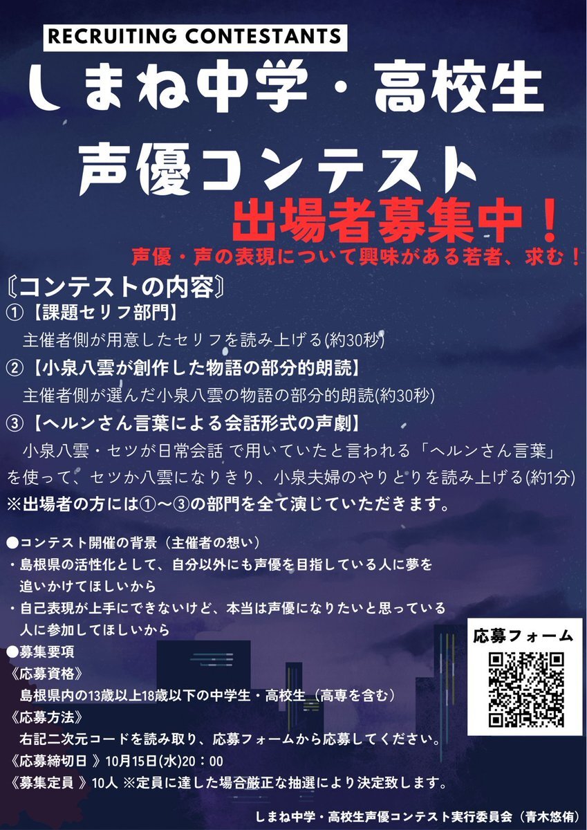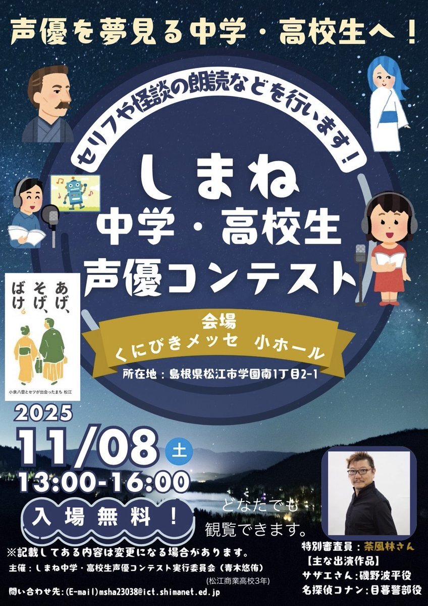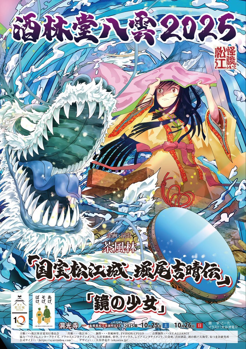 今回の酒林堂八雲2025は「国宝松江城、堀尾吉晴伝」、 そして小泉八雲原作「鏡の少女」も同時公演します! 茶風林、山口勝平、伊藤美紀、中原麻衣、川原慶久、鶴岡聡に加えて、肘岡拓朗、荒井萌、依藤聡の3名が追加出演決定! チケットはシマチケにて! まだ購入可能です! cul-shimane.jp/hall/ticket/
