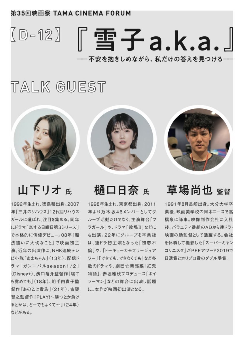 🎫第35回 #TAMA映画祭 プログラム 『雪子 a.k.a.』 トークゲストに 🎉\#草場尚也 監督の登壇が決定!/🎉 #山下リオ 氏と #樋口日奈 氏と3人で貴重なお話を伺います! 11/23(日)はベルブホールへ! 🎫チケット購入はこちらから👇 teket.jp/10219/59281 pic.x.com/ui4ym5WtuF