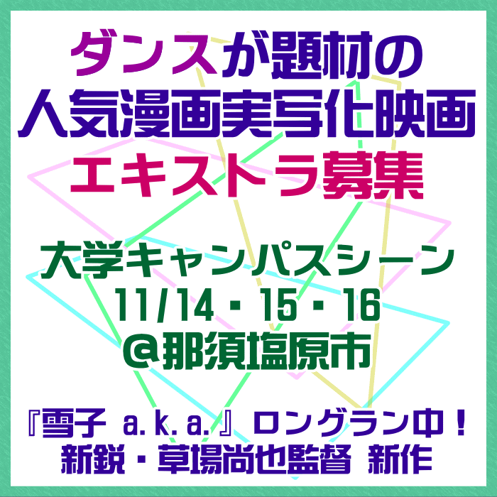 🔔エキストラ募集◆2026年公開・ダンスが題材の人気漫画原作実写化映画 📅11/14・15・16大学生役@#那須塩原市<〆11/10 📢新鋭 #草場尚也監督(『#雪子aka.』ロングラン公開中!) tokyo.mport.info/ex/n20/invite/… - 東京エキストラNOTES pic.x.com/949WDQzruH
