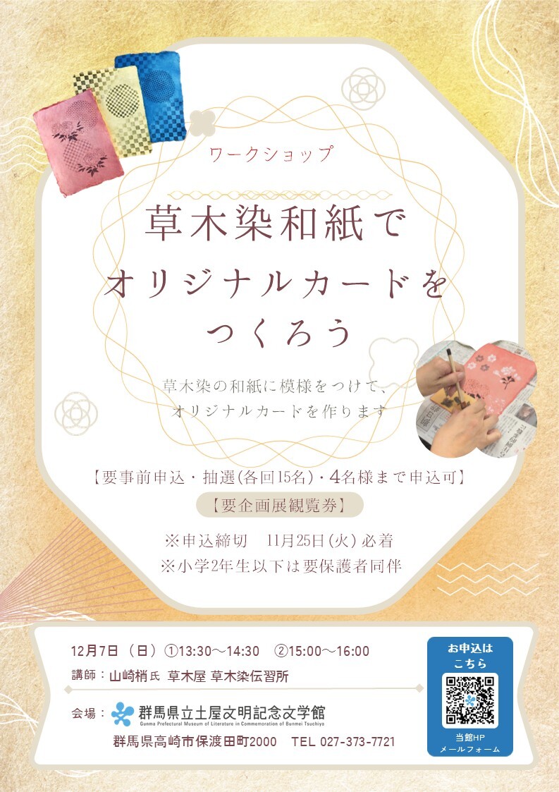 【愛の手紙展 ワークショップ 参加者募集】 12月7日(日)開催 🌱草木染和紙でオリジナルカードをつくろう📨 申込受付中です! 草木染の独特な色合いの和紙に、お好きな柄の型を選んで絵の具をおとすと、あなただけのオリジナルカードができます✨ ご興味のある方はぜひ ご参加下さい☺️ #草木染 pic.x.com/Cydvwk8Tk6