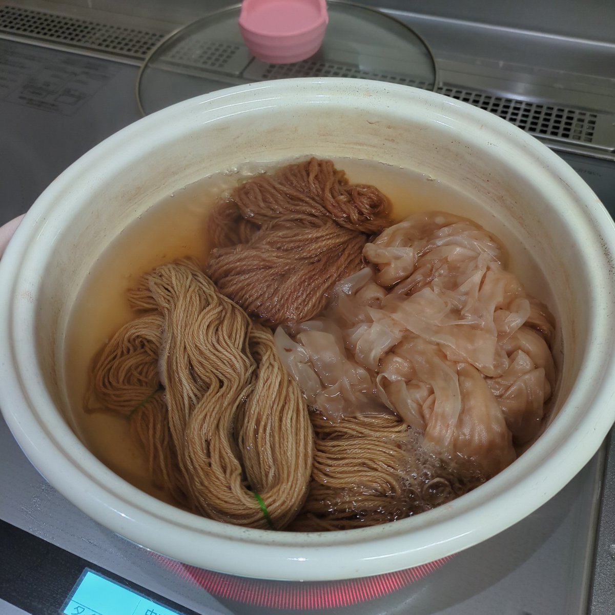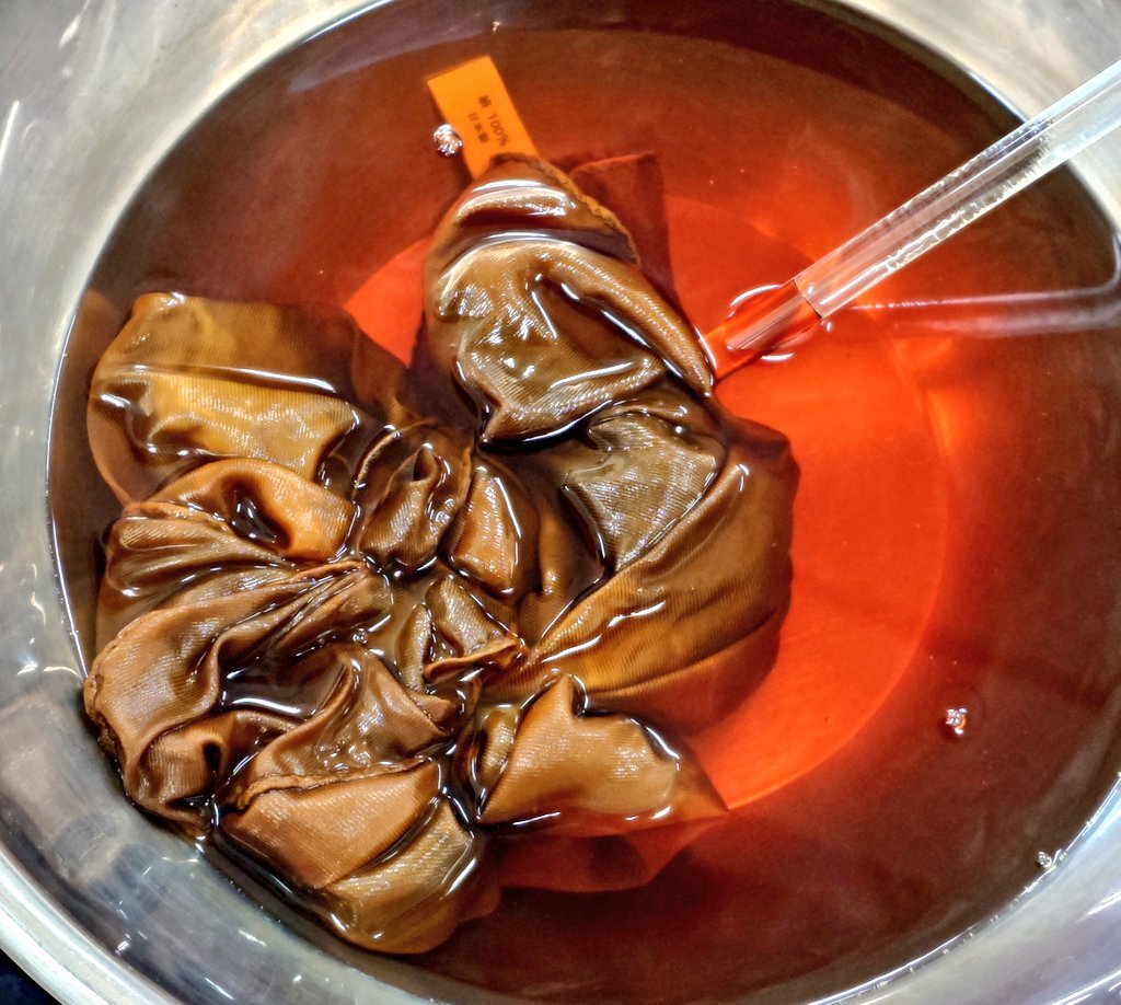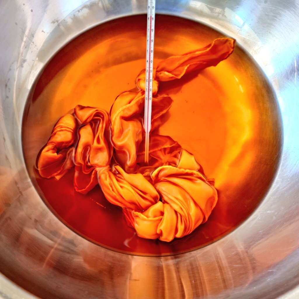 草木染の染液は萼を付けたままのマリーゴールド。午前中のうちに割り箸(中央1本のみ)で締めて染液に入れて60度、その後3本で締めてアルミ媒染から染液に入れて85度まで加熱した。午後はそのまま鉄媒染をして85度まで加熱した。#草木染 #マリーゴールド #アルミ媒染 #鉄媒染 pic.x.com/w1Ru09H2Zi