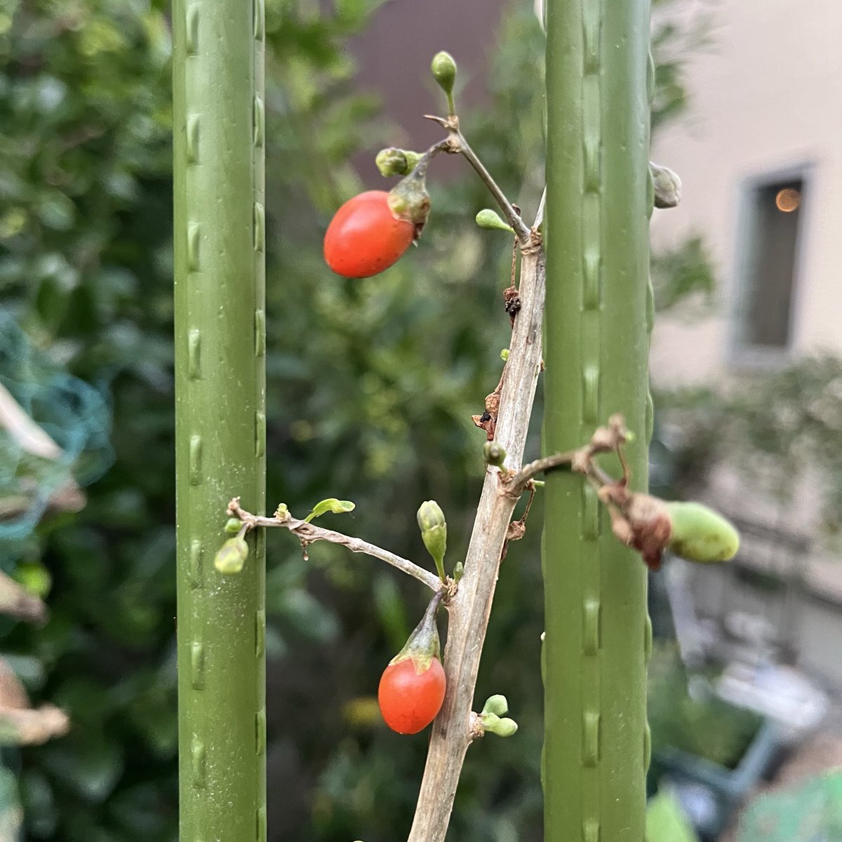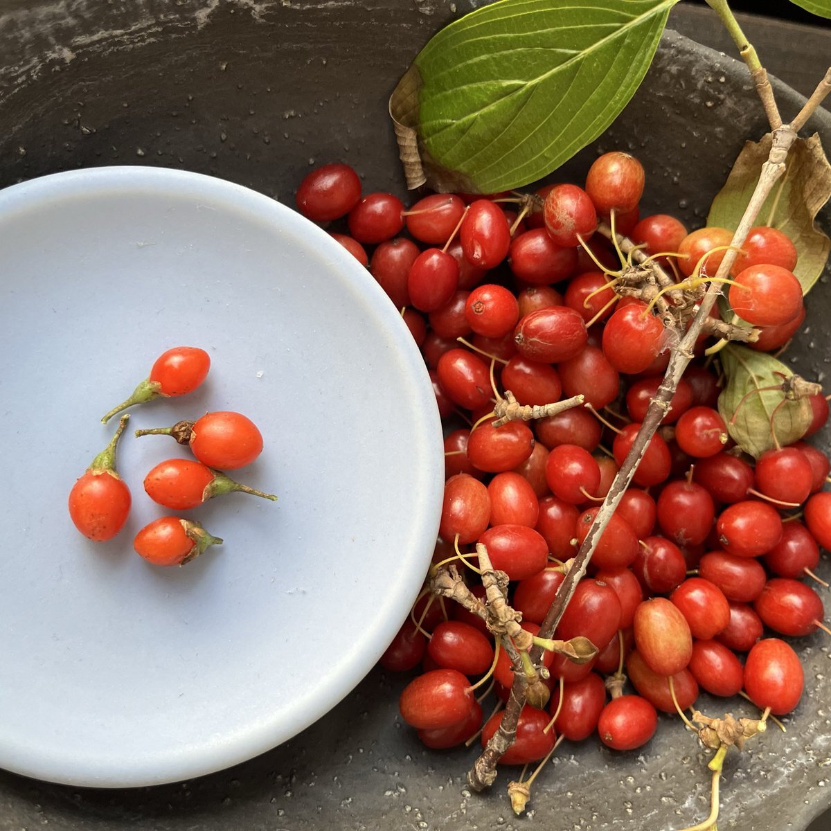 お早うございます!染めジイです。庭のサンシュユとクコの実5つを収穫しました。クコは小さな種なので、緑のヘタを取ってそのまま乾燥させるということですが、我が家のクコは極小です。最高級の貢果枸杞の乾燥前は、すごく大きな実が想像できます。薬色同源(^-^) #草木染 #生薬 pic.x.com/5NiFVA2ngW