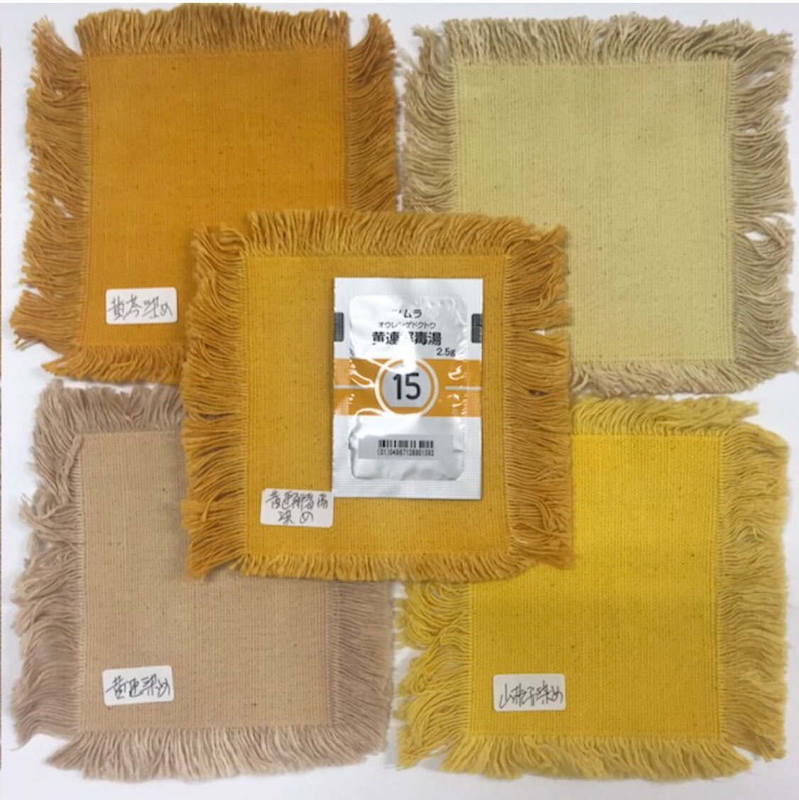 お早うございます!染めジイです。私の生薬染めは、木綿のコースターを染めるところから始まりました。黄連染め・黄ごん染め・黄柏染め・山梔子染めと黄連解毒湯染めを試しました。漢方屋しか考えない染めでしょうね。ツムラの⑮番のヒートの色になりました。(^ ^;;薬色同源(^-^) #草木染 #生薬 pic.x.com/tW3IUstr2y