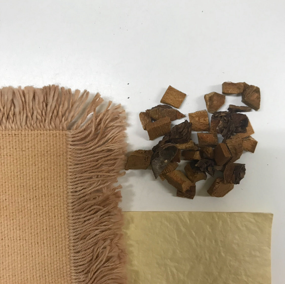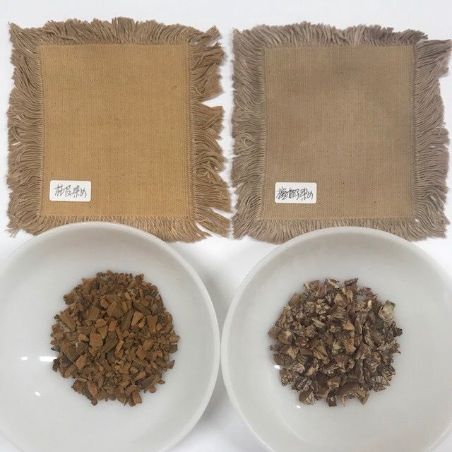 お早うございます!染めジイです。私の生薬染めは、木綿のコースターを染めるところから始まりました。桂皮染めと檳榔子染めは、アルミ媒染では生薬の色がそのまま染まった感じです。ビンロウジは鉄媒染で檳榔子黒という、留めそでを染める黒になるそうです。薬色同源(^-^) #草木染 #生薬 pic.x.com/yv0KOoQtMF