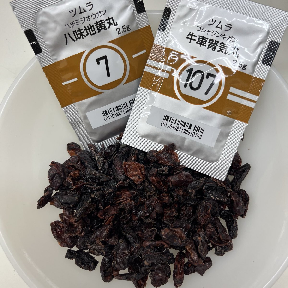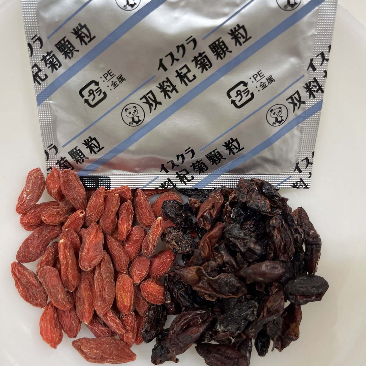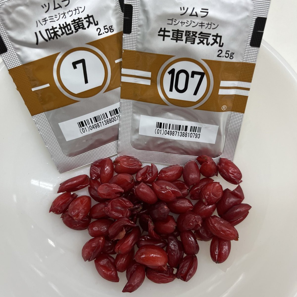 お早うございます!染めジイです。庭のサンシュユとクコの実5つを収穫しました。どちららも生で味わうと渋くてまずいのに、乾燥するとサンシュユは酸っぱく、クコは甘くなるようです。サンシュユとクコどちらも配合されている漢方は、飲む目薬の杞菊地黄丸です。薬色同源(^-^) #草木染 #生薬 pic.x.com/AVOpo7JLwI