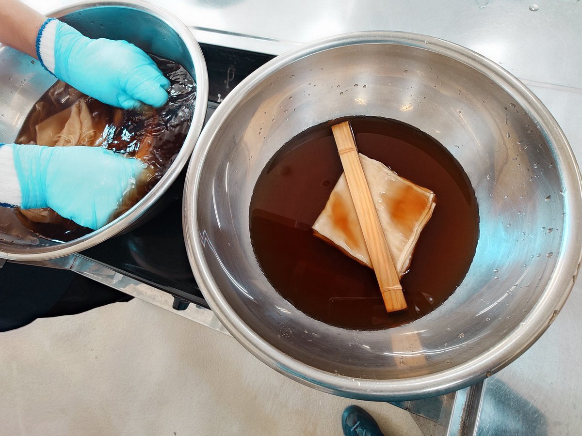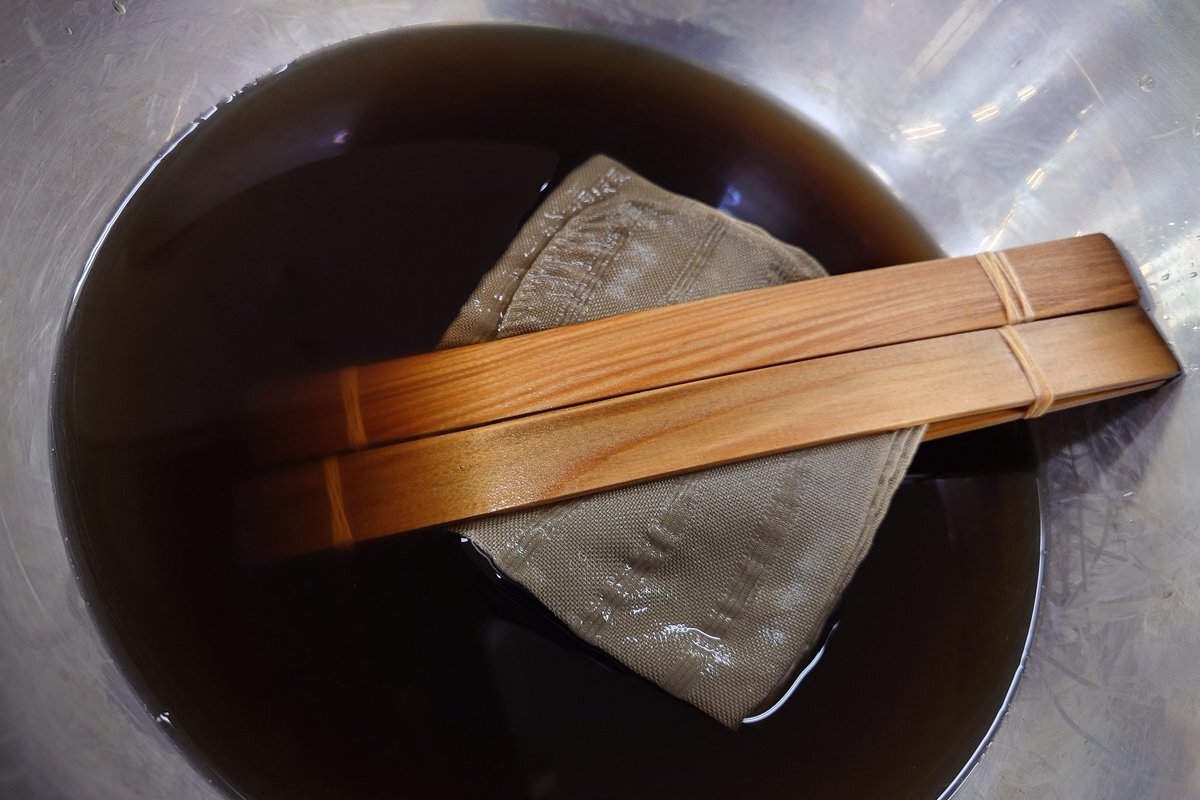 草木染の一日コースに参加した。10月の染料は珈琲。出がらしの粉を使ってアルミ媒染と鉄媒染を重ねた。布を折りたたんで板で重なり具合を工夫して見本と同じようなものを目指した。#草木染 #日本絹の里 #珈琲の粉 #アルミ媒染 #鉄媒染 pic.x.com/Sa7nJReFXA