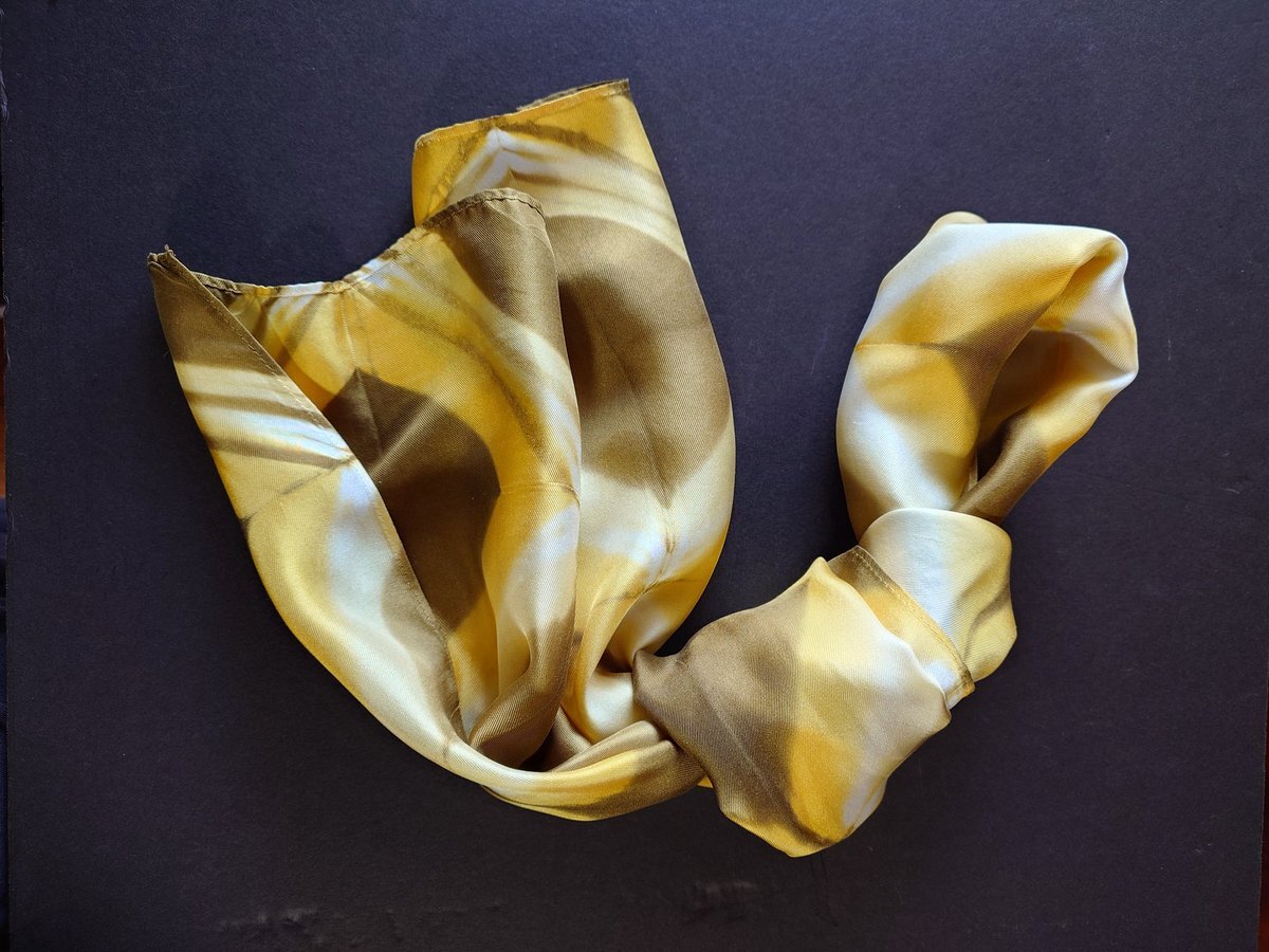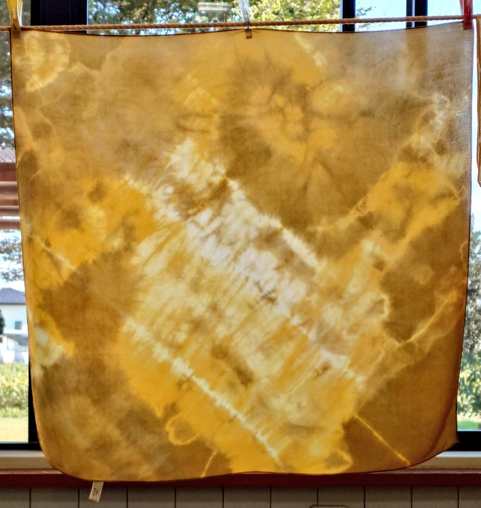 草木染の自主活動に参加して玉葱の皮から煮出した染料を使ってアルミ媒染と鉄媒染の重ね染めをしたら面白い模様のスカーフが出来上がった。玉葱の皮を我が家に届けてくれたお友だちのYさんにお礼にあげたいと思う。#草木染 #玉葱の皮 #アルミ媒染 #鉄媒染 #スカーフ pic.x.com/8auoAUBGMx