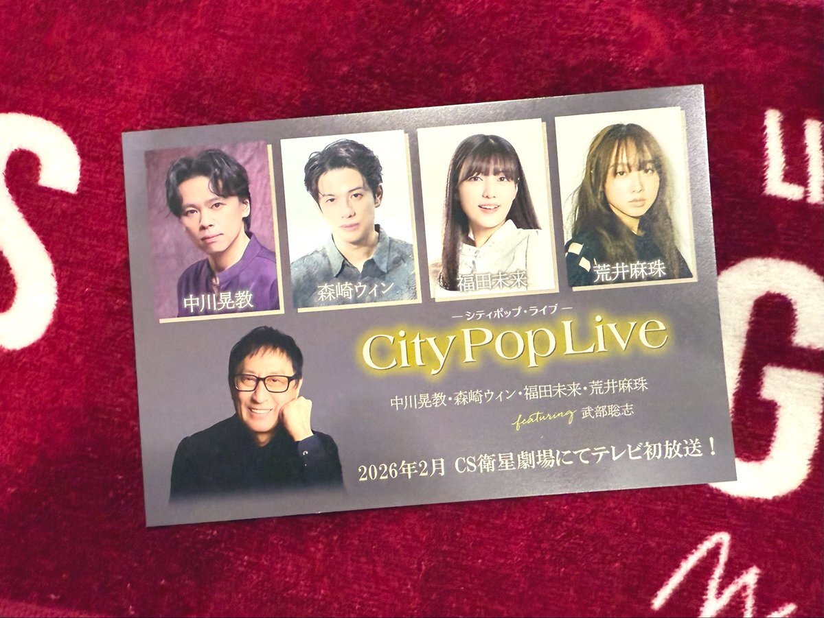 いただいたポストカード😊 裏面が大事w!なので載せておきます💛 CS衛星劇場さん、いつも放送をありがとうございます💛 #シティポップライブ #中川晃教 #森崎ウィン #福田未来 #荒井麻珠 #武部聡志 #衛星劇場 pic.x.com/m7pvtbjVnV