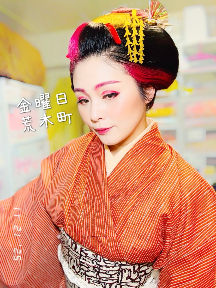 金曜日荒木町❣️今日は、中央線に乗ってから仕事用スマホを忘れた事に気づいて下車Uターン時間的に泣く泣くタクシーで四谷へ。タクシー運転手さん曰く、さっき四谷駅で人身事故だったみたいですよーとの事。守られてるのかも?😅いってきまーす。 #荒木町 #四谷三丁目 #流し #荒木ちえ #着物 #日本髪 pic.x.com/CBGyu4pMsm