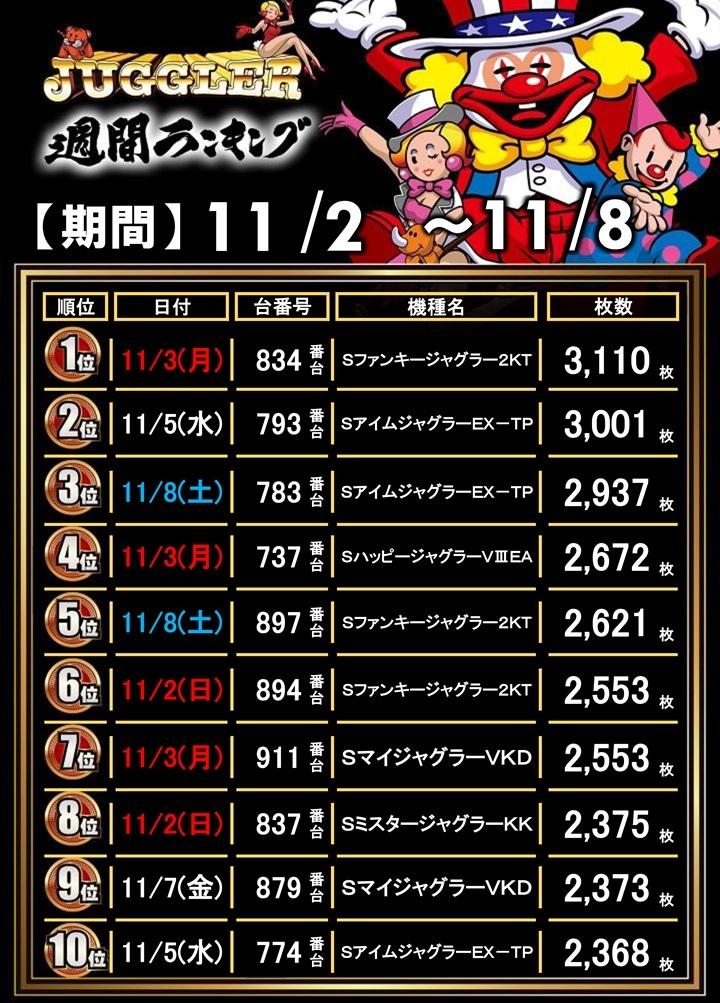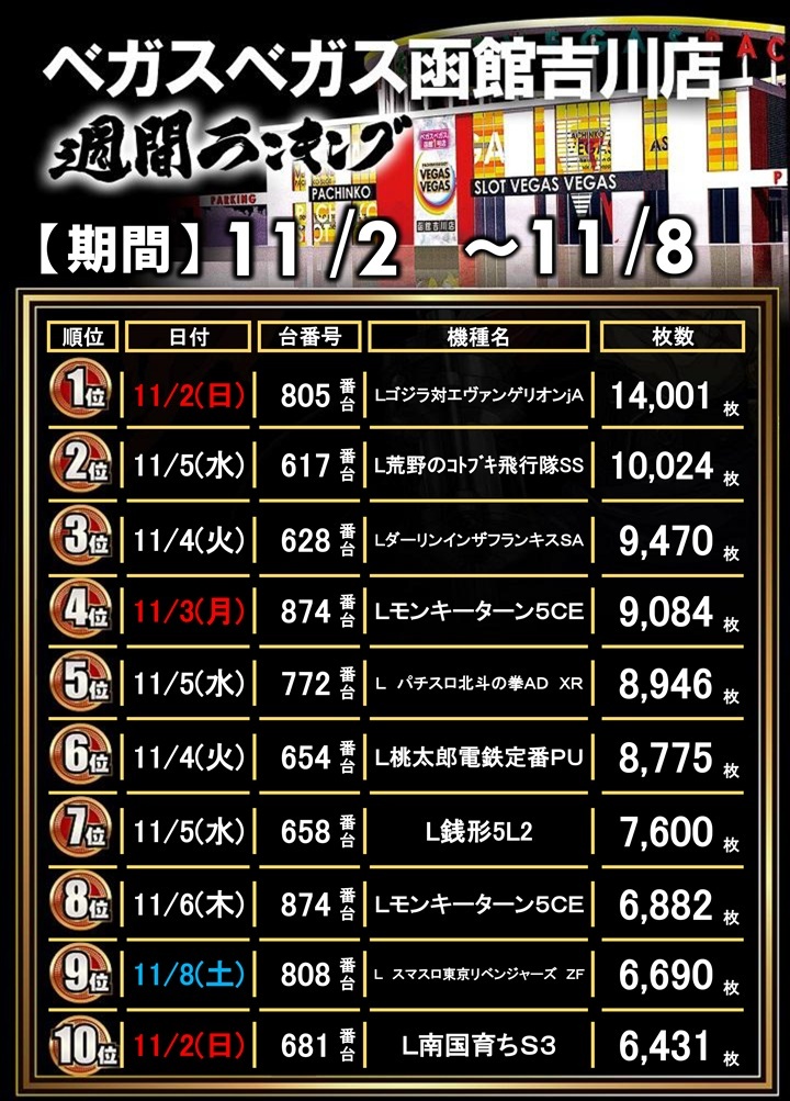 おはようございます😁 ゲーム大好きOです🤠 最近ますます寒くなってきましたね🥶 そんな寒い日は吉川ベガスで温まっていきませんか😚 さて出玉ランキング更新です😉 全体ランキングでは万枚overが2台もΣ(・ω・ノ)ノ! #ゴジラ対エヴァンゲリオン #荒野のコトブキ飛行隊 pic.x.com/HFMadS9AqT