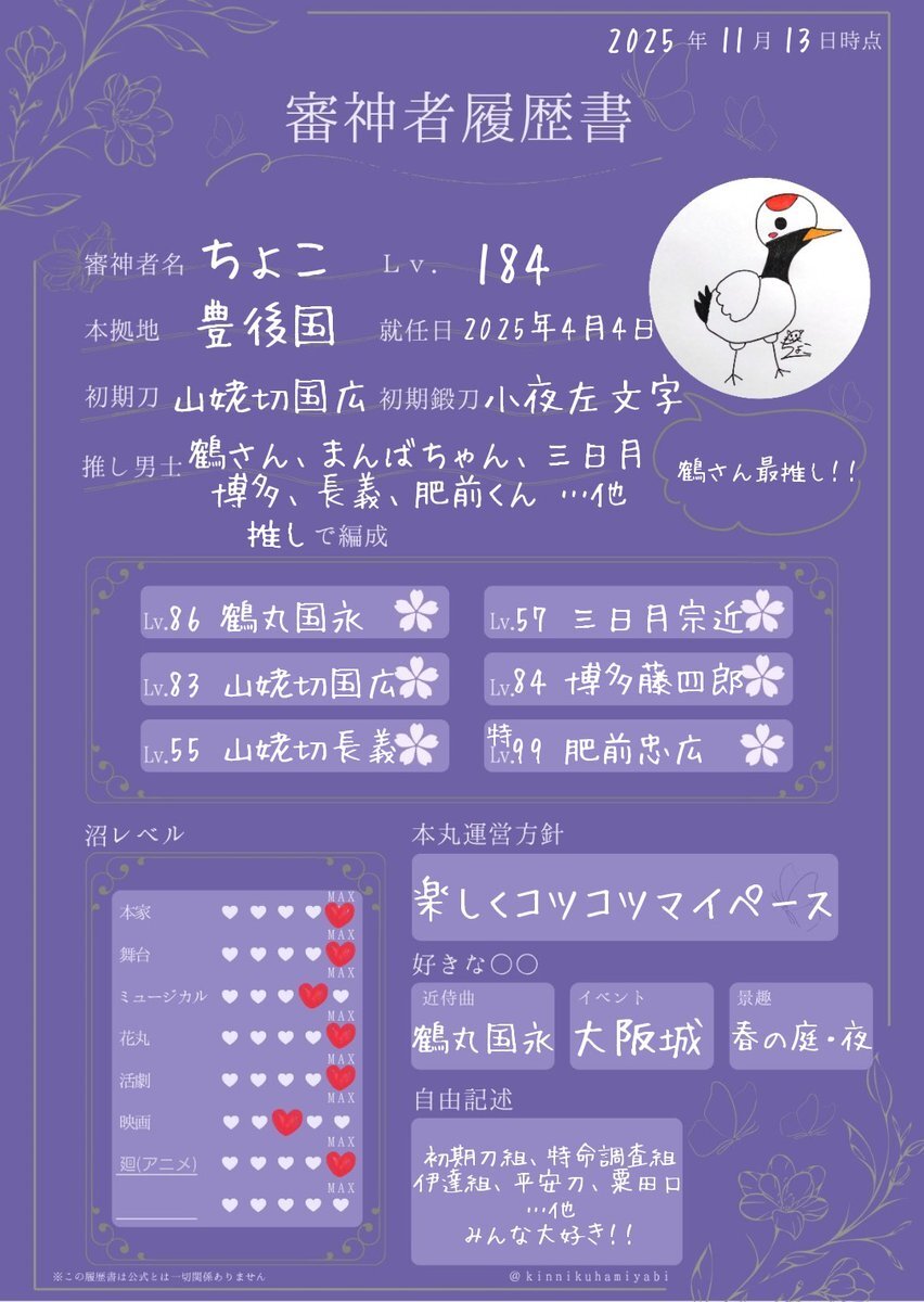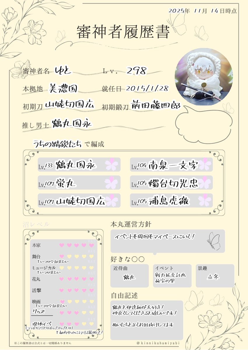 素敵な審神者履歴書テンプレ使わせていただきました☺️✨ おしゃべり大好きなので仲良くしてくれたら嬉しいです💖 よろしくお願いします! ♡かRTで気になった方をお迎えさせていただきます! #菊の香り高い星の入り東風の季節に刀剣乱舞好きさんと繋がりたい #審神者履歴書 x.com/kinnikuhamiyab…