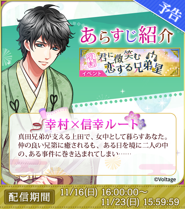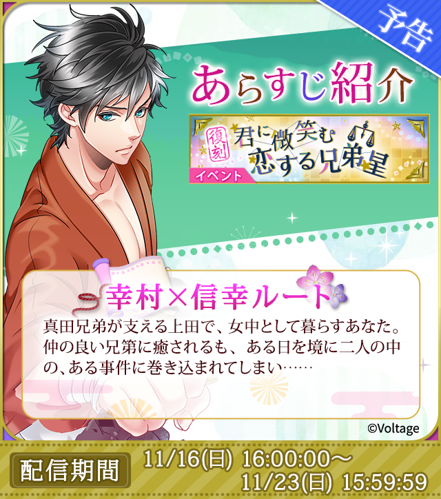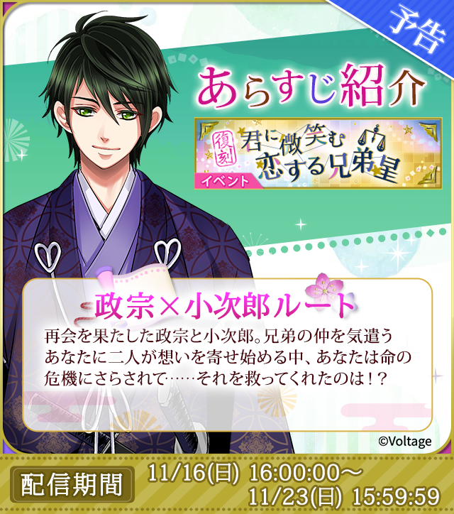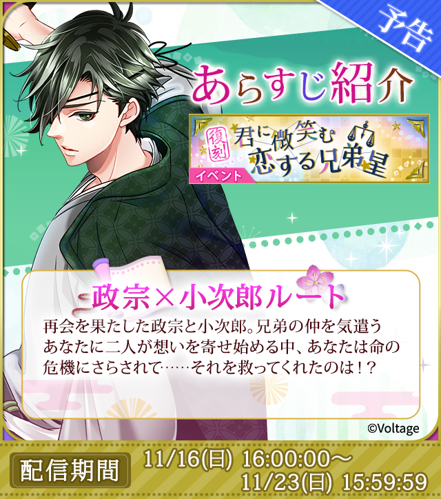 #恋乱LB#華の章 #ボル恋 姫たちに贈る11月の新イベントは…… 🌸『【復刻】君に微笑む恋する兄弟星』🌸 魅力的な兄弟に挟まれて、どちらかを選ぶことに──? あなたの選択で恋が始まる物語 配信期間:11/16(日)~11/23(日) #幸村×#信幸 #政宗×#小次郎 #利家×#利久 #兼続×#与七 pic.x.com/82jBRjQ03m