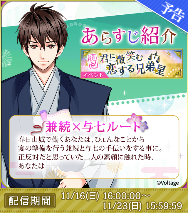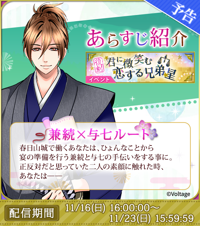 #恋乱LB#華の章 #ボル恋 イベント『【復刻】君に微笑む恋する兄弟星』配信中🌸 11/19(水)16:00より後半ルートが追加予定★ 本日は兼続×与七ルートのあらすじをご紹介! 明日からの配信をお楽しみに……♪ #直江兼続 #樋口与七 pic.x.com/VXYq8XC8IU