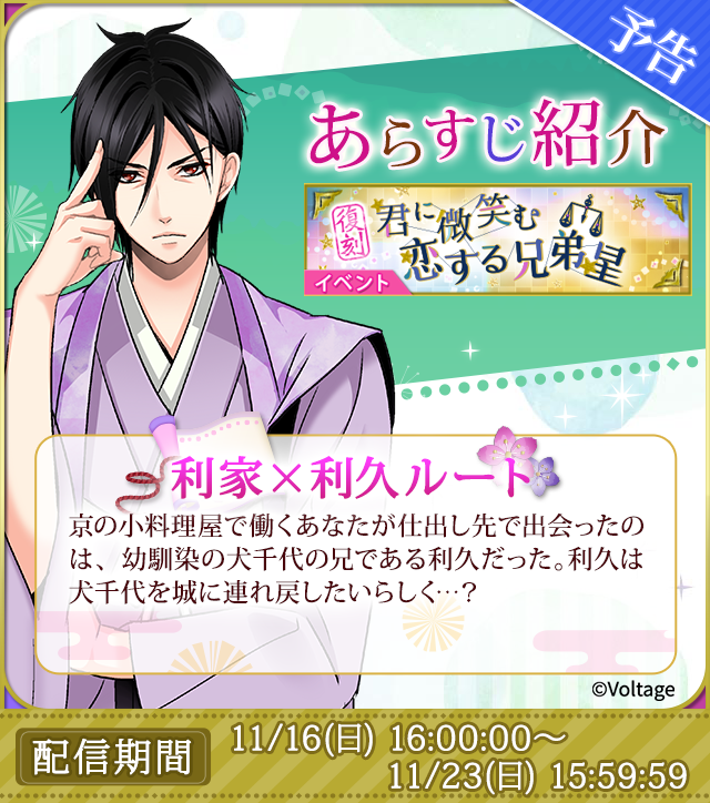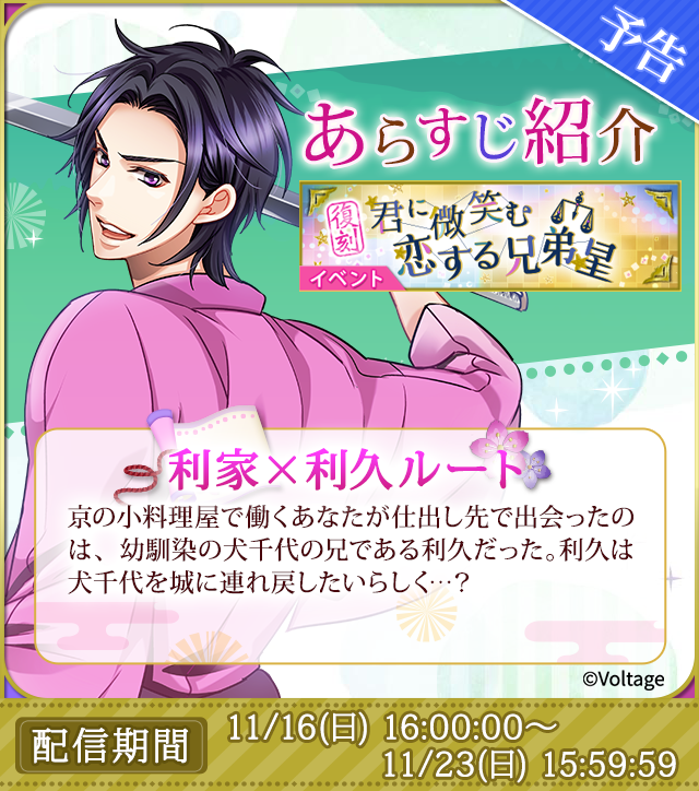 #恋乱LB#華の章 #ボル恋 イベント『【復刻】君に微笑む恋する兄弟星』が11/16(日)16:00より配信予定🌸 前半に選択できるルートのあらすじを公開するよ♪ 本日は利家×利久ルートをご紹介♡ 明日からの配信をお楽しみに……♪ #前田利家 #前田利久 pic.x.com/vqSAjNbVFV