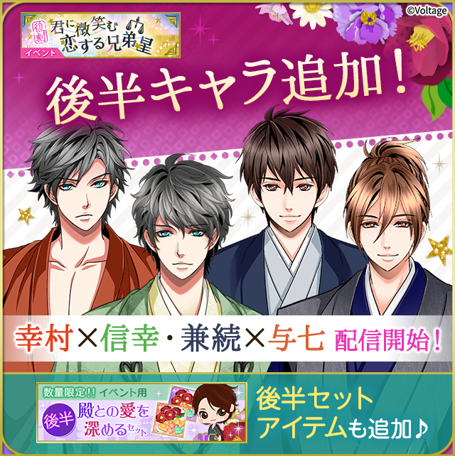 #恋乱LB#華の章 #ボル恋 イベント『【復刻】君に微笑む恋する兄弟星』配信中🌸 幸村×信幸、兼続×与七ルート追加! 物語を読み進めるのに役立つイベント後半セットアイテムも販売開始★ #真田幸村 #真田信幸 #直江兼続 #樋口与七 pic.x.com/mlLU9JVSlV