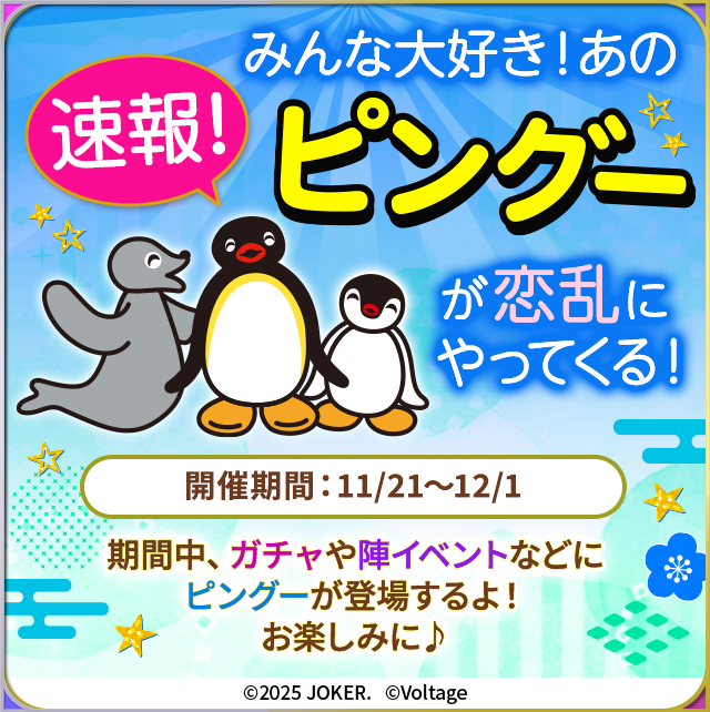#恋乱LB#華の章 #月の章 #ボル恋 明日からは待望の『 #ピングー 』コラボ開催! 開催期間:11/21(金)~12/1(月) ガチャや陣イベント、ミッションキャンペーンを実施予定♪ pic.x.com/RnAEB62M9q