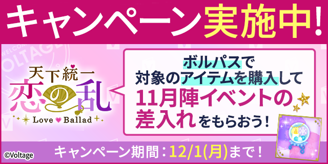 #恋乱LB#華の章 #月の章 #ボル恋 \キャンペーン実施中!/ #ボルパス で対象のアイテムをご購入いただくと、 開催中の陣イベントで使える「差入れアイテム」をプレゼント💛 キャンペーンは、12/1(月)15:59:59まで! ▼詳しくはこちら▼ passports.voltage.co.jp/contents_info?… pic.x.com/VjCZXtWFKu