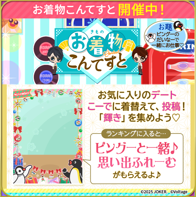 #恋乱LB#華の章 #月の章 #ボル恋 👗『 #お着物こんてすと 』開催中! 今回のこーでのお題は『ピングーのだいなーで一緒にお仕事』🍔 お題に合わせたこーでに着替えて、投稿しよう♪ #ピングー と一緒におしゃれを楽しもう♡ 配信は、12/1(月)15:59:59まで! pic.x.com/EXeZDe4Iig