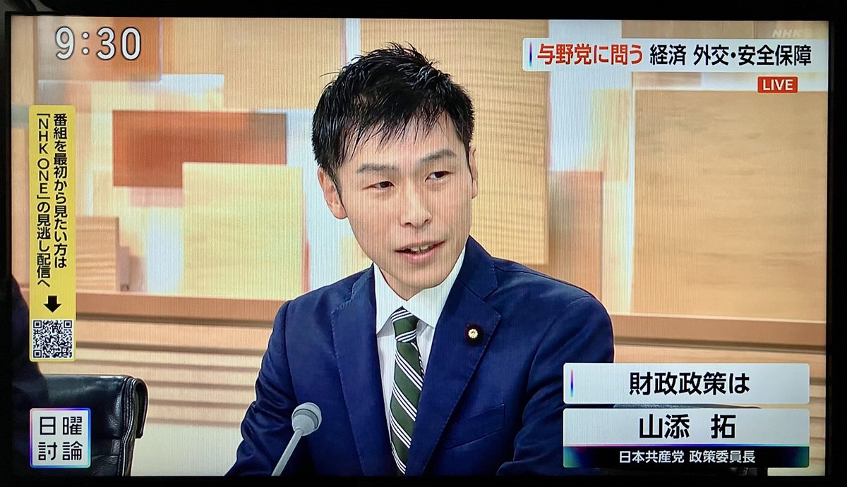 NHK #日曜討論 に #山添拓 政策委員長が出演。 「積極財政というが、消費税減税はやらない、医療費4兆円削減などくらしのためではない。軍事費GDP比2%の前倒し、大企業への投資、80兆円の対米投資、高市政権の積極財政は大軍拡と大企業と米国のため。くらしも経済も壊してしまう危険な道だ」