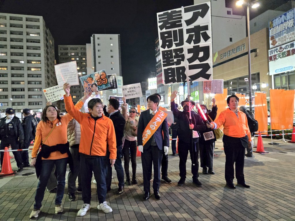 つばさの党が綺麗に中継してた。 しっかり叱られてる鈴木のぶゆき。背後には多民族都市東京プラカ👍🏻 #葛飾区議会議員選挙 #デマと差別を許さない #葛飾をデマと差別から守ろう pic.x.com/f3PoDfJxO2