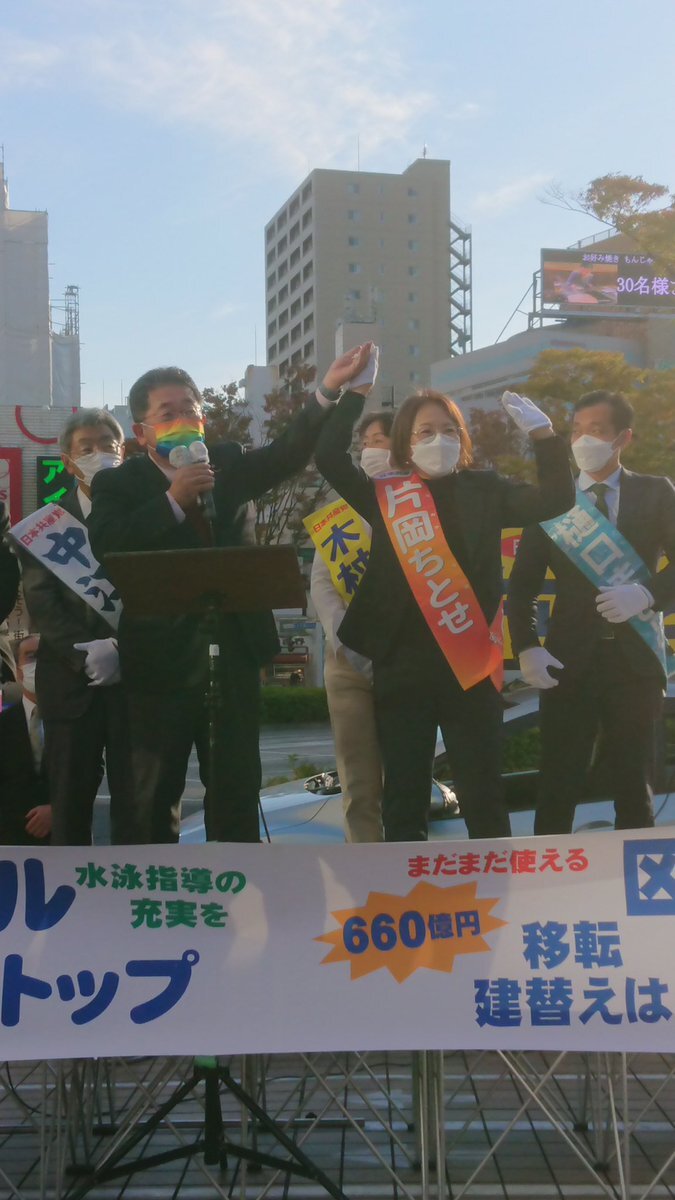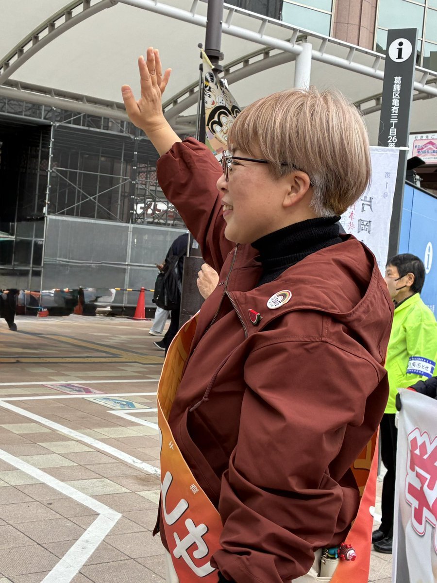 15:30~亀有駅前の #片岡ちとせ さんwith #宮本徹 さん街宣の応援にお邪魔して参りました! 駅前は各候補者がひしめき #葛飾区議会議員選挙 らしい賑やかさでしたが、持ってたチラシは全部受け取ってもらえました! 激戦です!片岡さんに絶対に2期目を務めて貰いたい!必勝!✊️ #葛飾区 #勝つしか区 x.com/c_kataokaJCP/s…