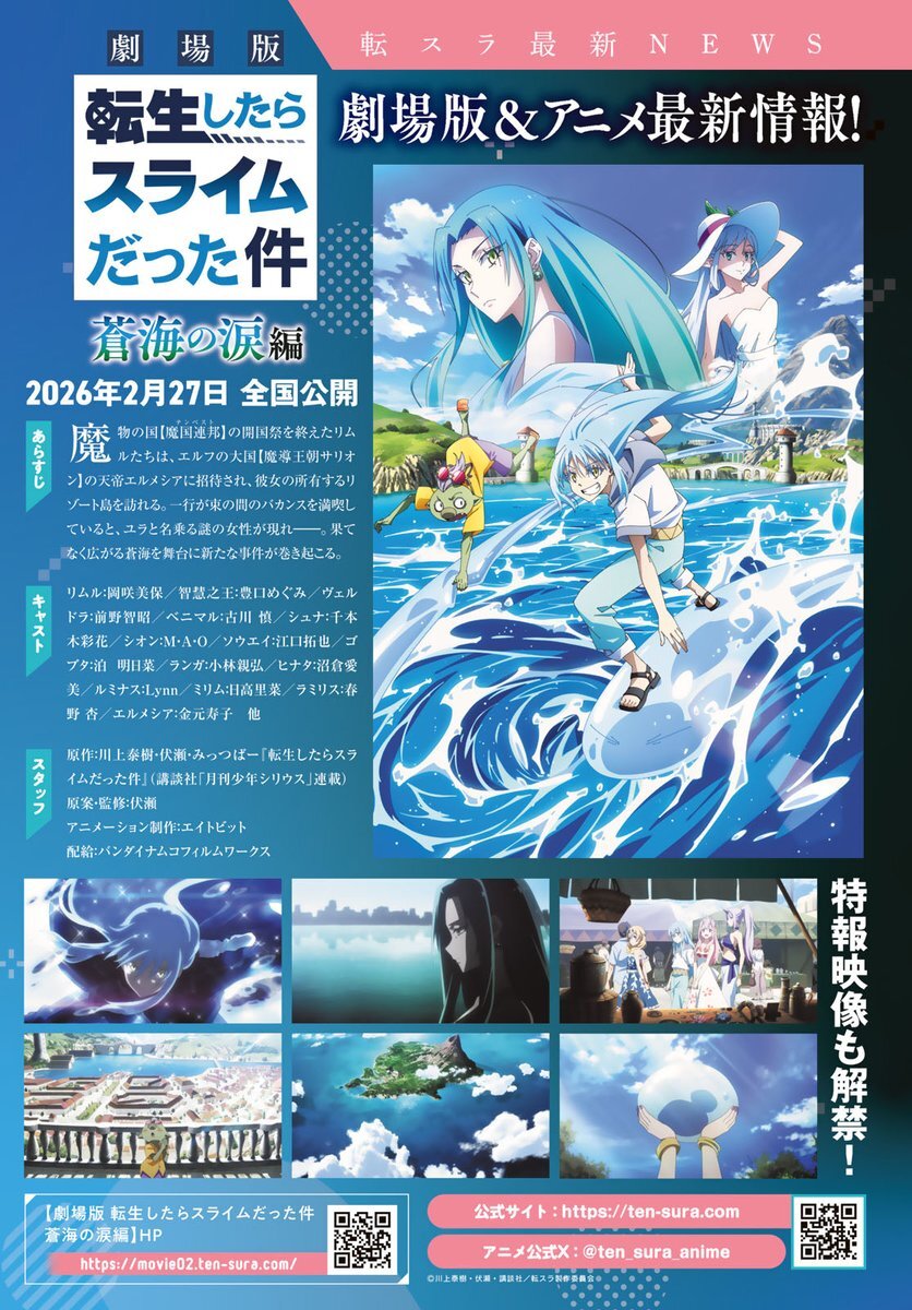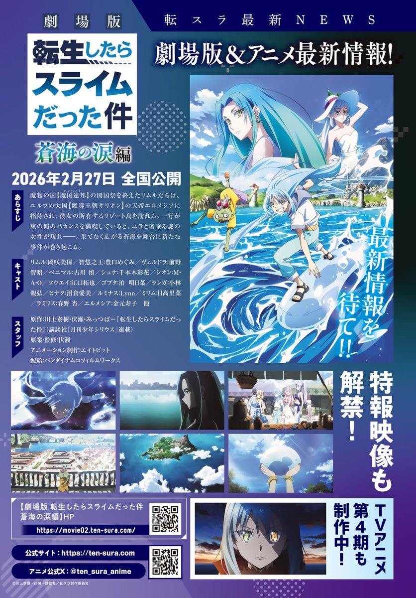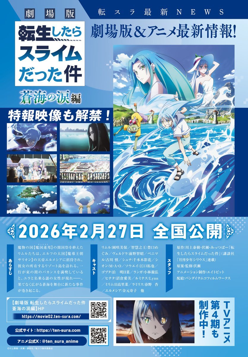 💙#転スラ NEWS💙 // 劇場版 #蒼海の涙 編 2026年2/27全国公開‼️ 特報映像も解禁🎉 TVアニメ第4⃣期、制作中🙌 \\ 『#転生したらスライムだった件』 最新情報は #月刊少年シリウス12月号 で👍 アニメ公式➡️@ten_sura_anime #伏瀬 #川上泰樹 @Taiki_Kawakami #みっつばー @mitz_vah pic.x.com/9oE0ttfy9J