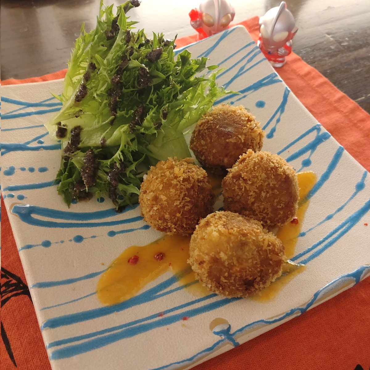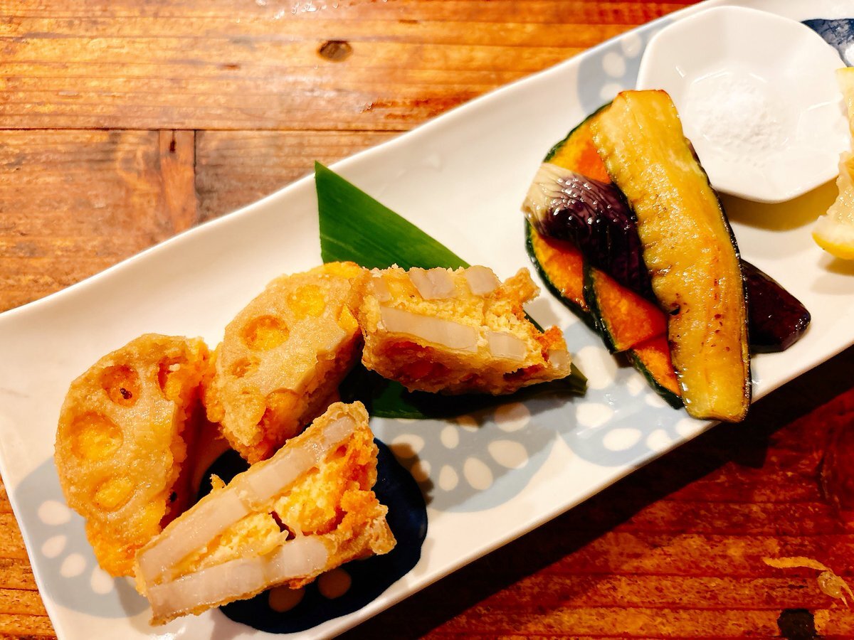 今日は当店の、#秋冬の定番のオススメ 「#里芋と蓮根のミニコロッケ」 始めてます😁 #お出汁 と一緒に煮込んで潰した、#里芋 とコロコロにカットした #蓮根 を一口サイズの #コロッケ に😄 フレッシュ #トマト を使ったソースを添えて❤ トロトロの里芋と、アクセントに入れた蓮根が美味しいですよ〜😁 pic.x.com/DX0CMYjtfO