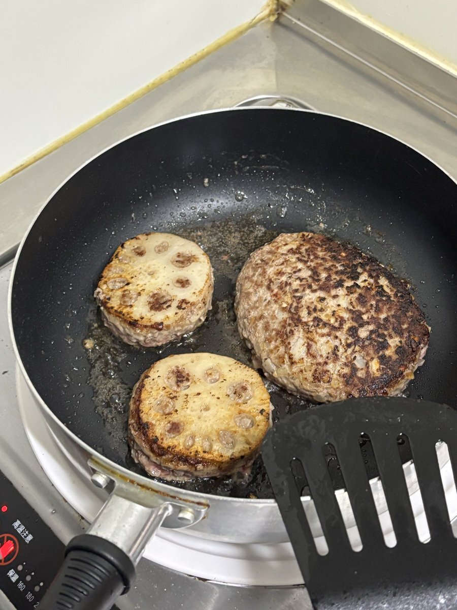 久しぶりに蓮根ハンバーグを作ってます✨ コレからの時期、蓮根は美味しいしシャキシャキとした歯応え、火を通せばほっくりとして粘り気?もあり美味しい😋 今回は蓮根のみじん切りをバーグのタネに入れて蓮根で挟んでます! 無事に焼き上がりますように! #蓮根 #1人飯 #自炊 pic.x.com/o4tdm8O7YR
