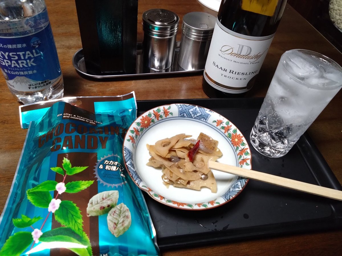 何を飲んでるかというと、ハスのきんぴらをつまみにキンミヤサワー🥳 夏に開ける機会を逃した辛口のリースリングを眺めながら。絶対に和食に合うワインです👍 北見のチョコミントキャンディーもイケるぜ😋 酔ってます😅 #キンミヤ焼酎 #蓮根のきんぴら pic.x.com/0MyobE4lAu