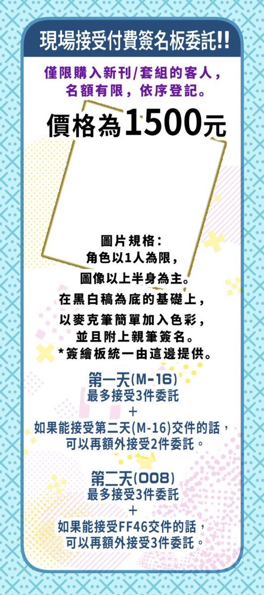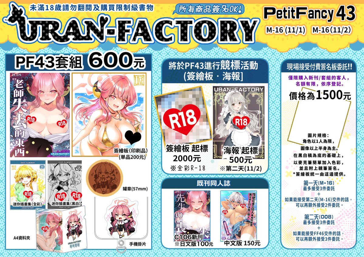 11月1〜2日開催の台湾PF46のお品書きです スペースはM16『URAN-FACTORY』 FFと似た内容ですが今回はセットにサイン入り簽繪板(印刷品)を追加しています! ミヨの描きおろしイラストのポスターを2日目にオークションします✨ 簽繪板も描きます✨ 台湾の皆さまよろしくお願いします #PF43 #蔚藍檔案 pic.x.com/zFL7hTlj9n