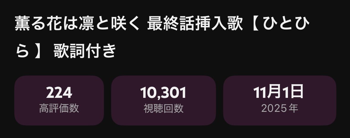 薫る花は凛と咲く最終話挿入歌【 ひとひら 】の視聴回数が1万回再生を突破しました! ありがとうございます😊 #薫る花は凛と咲く URL↓ youtu.be/Hevogc8Idkc?si… pic.x.com/m7PN4E1qW0